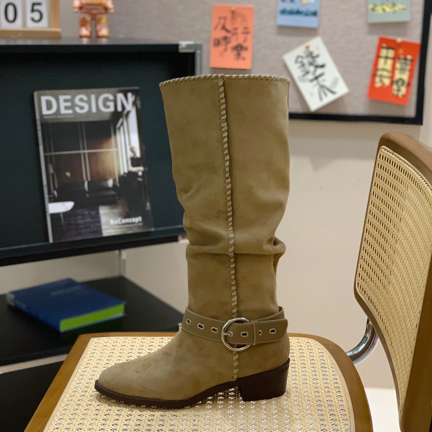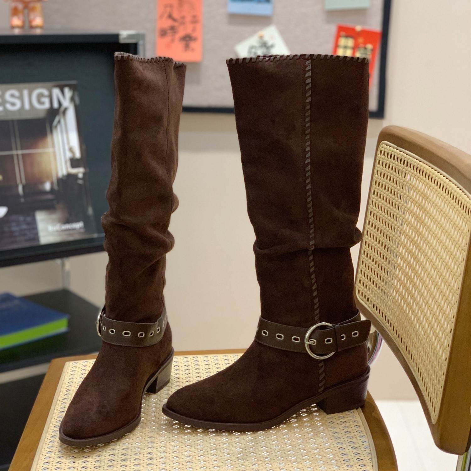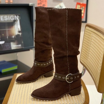 超火皮带扣绒面粗跟骑士靴女2025冬季爆款复古时尚百搭长筒堆堆靴