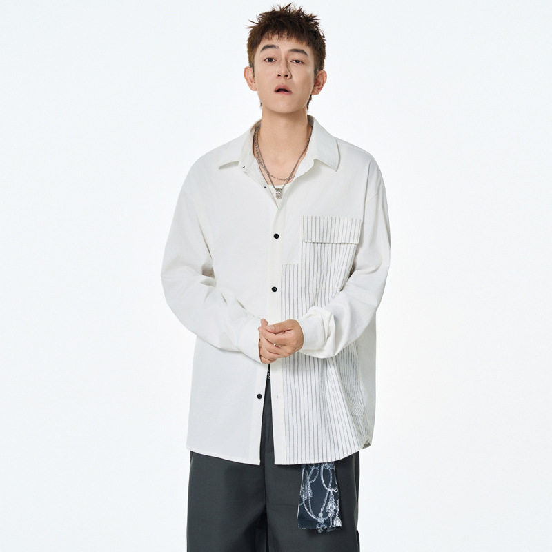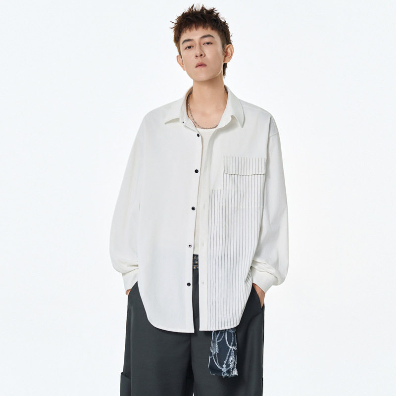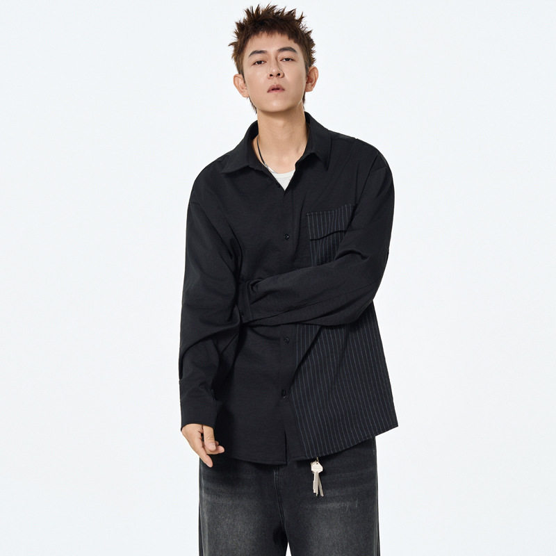 设计感春秋季男高街衬衫衬衣百搭休闲港风细条纹宽松长袖拼接