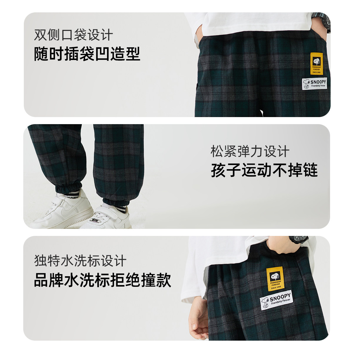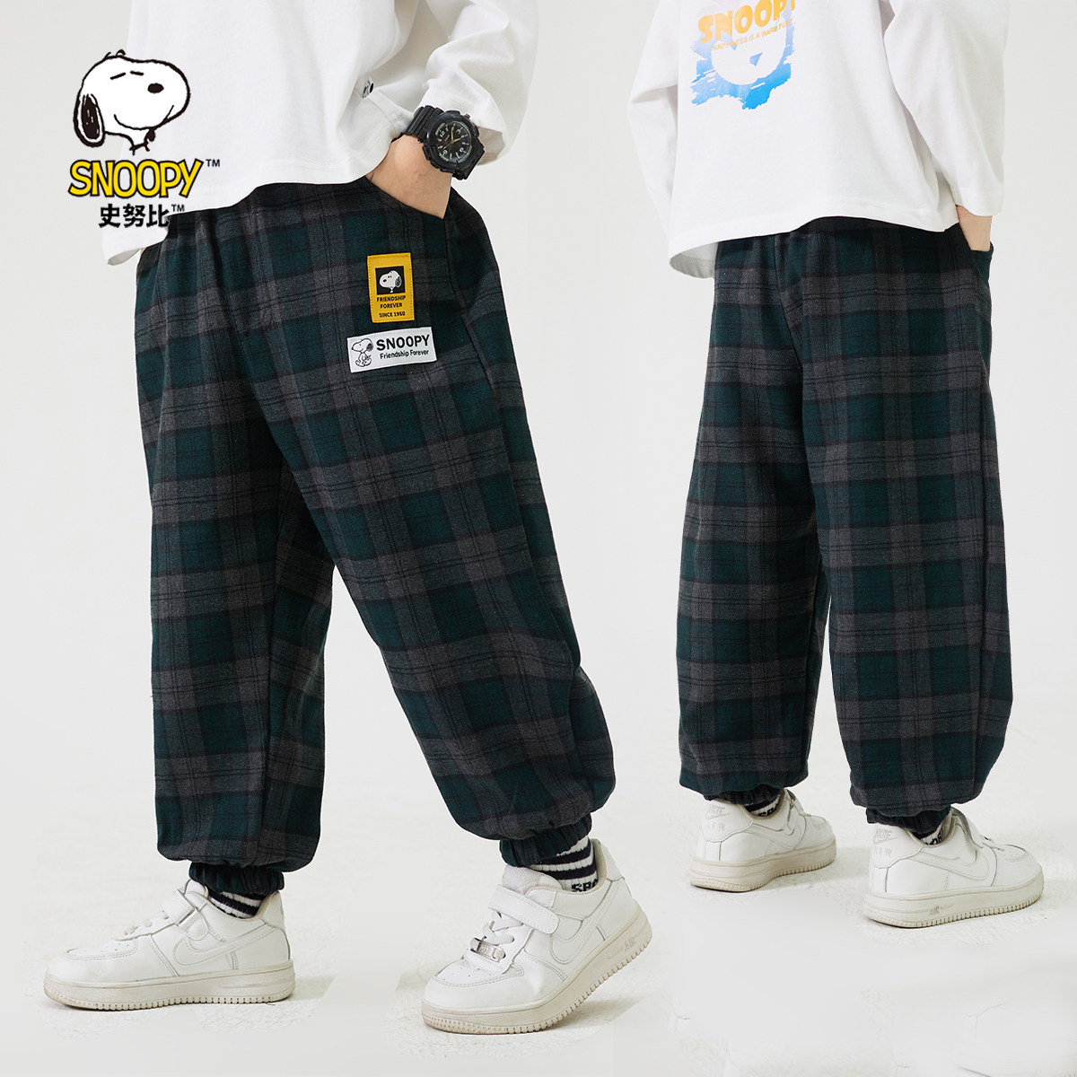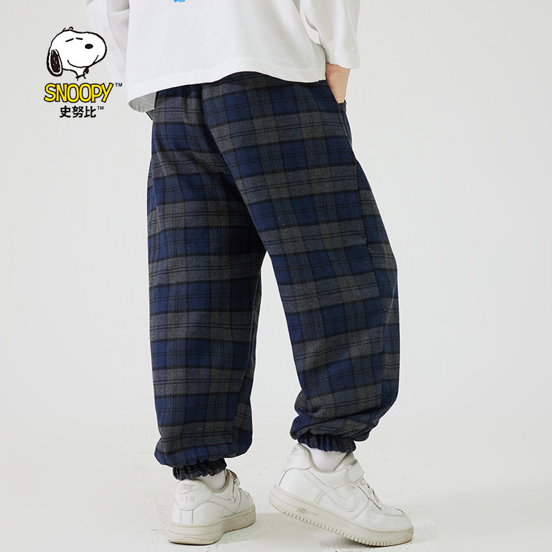 史努比男童加绒裤子一体绒秋冬装2025新款洋气时髦儿童装格子裤潮