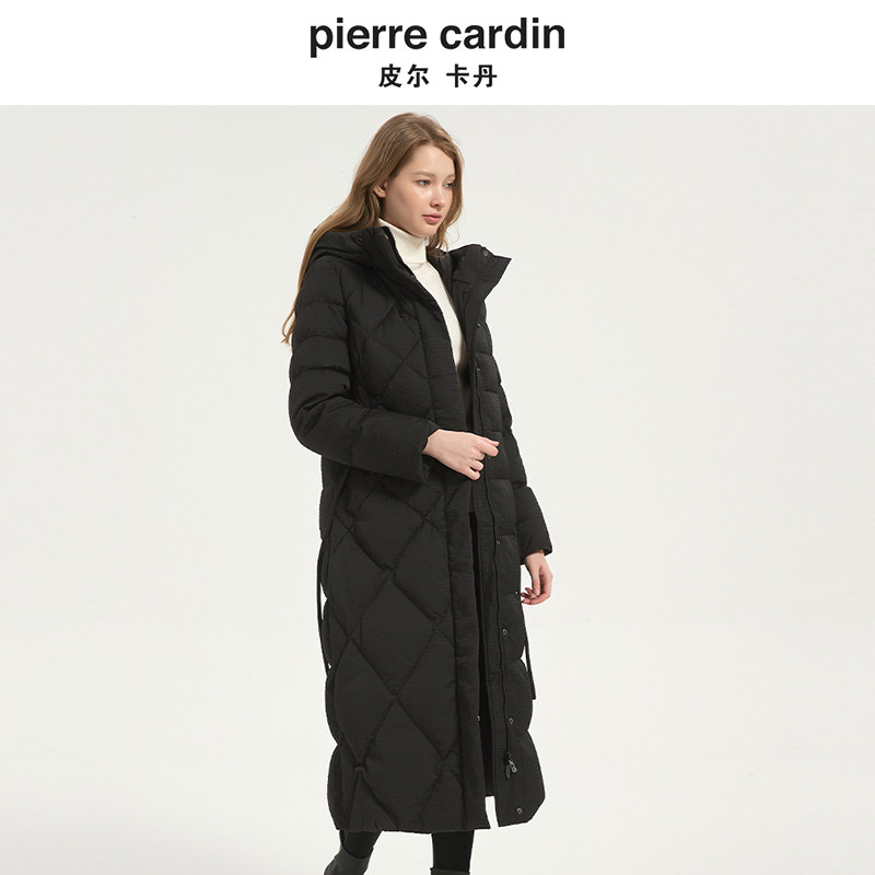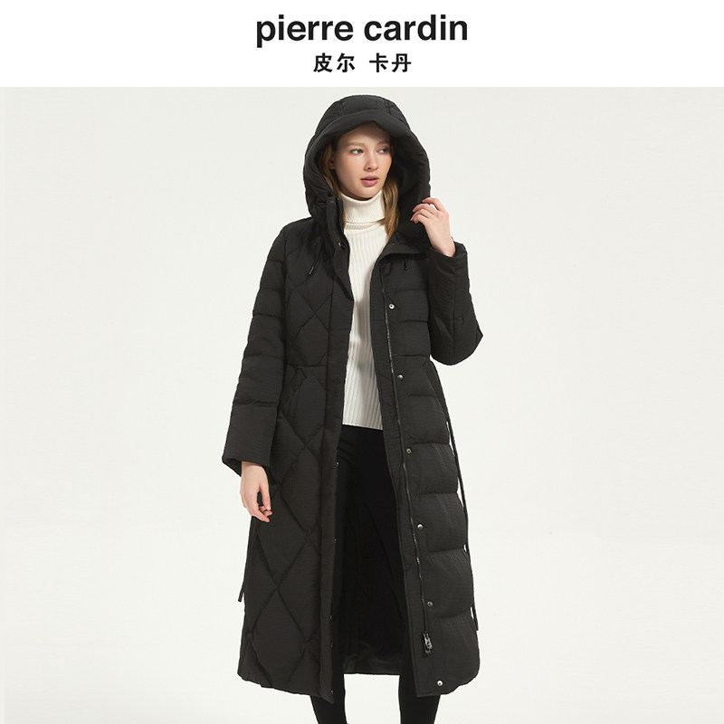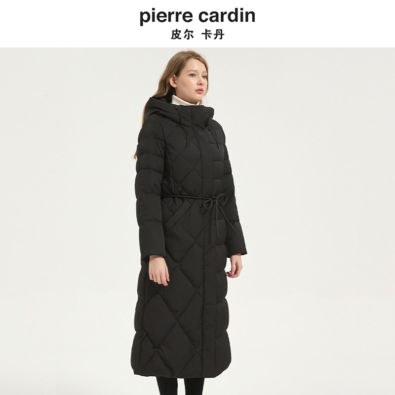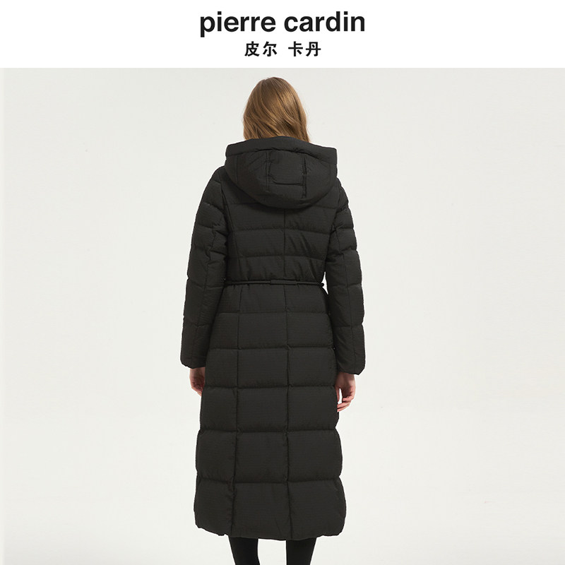 皮尔卡丹女装冬季新款黑色白羊绒连帽系带收腰羽绒服CD54YL036B0