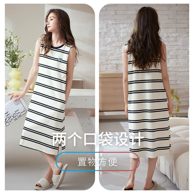 睡裙女夏季薄款纯棉无袖背心中长裙夏天条纹睡衣家居服大码连衣裙