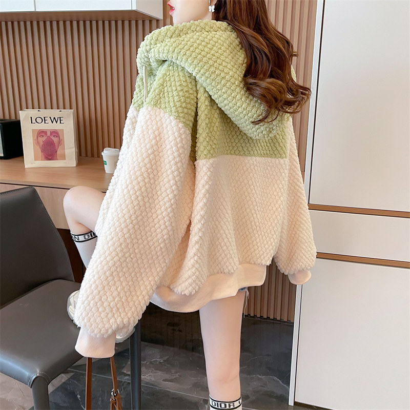 加绒加厚羊羔毛连帽外套女秋冬季韩版宽松百搭小个子拼接撞色卫衣