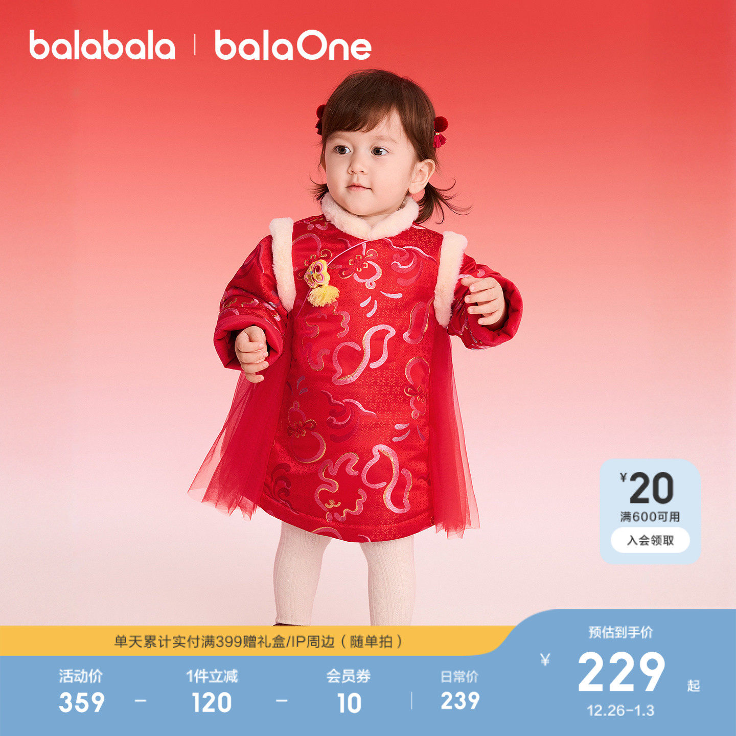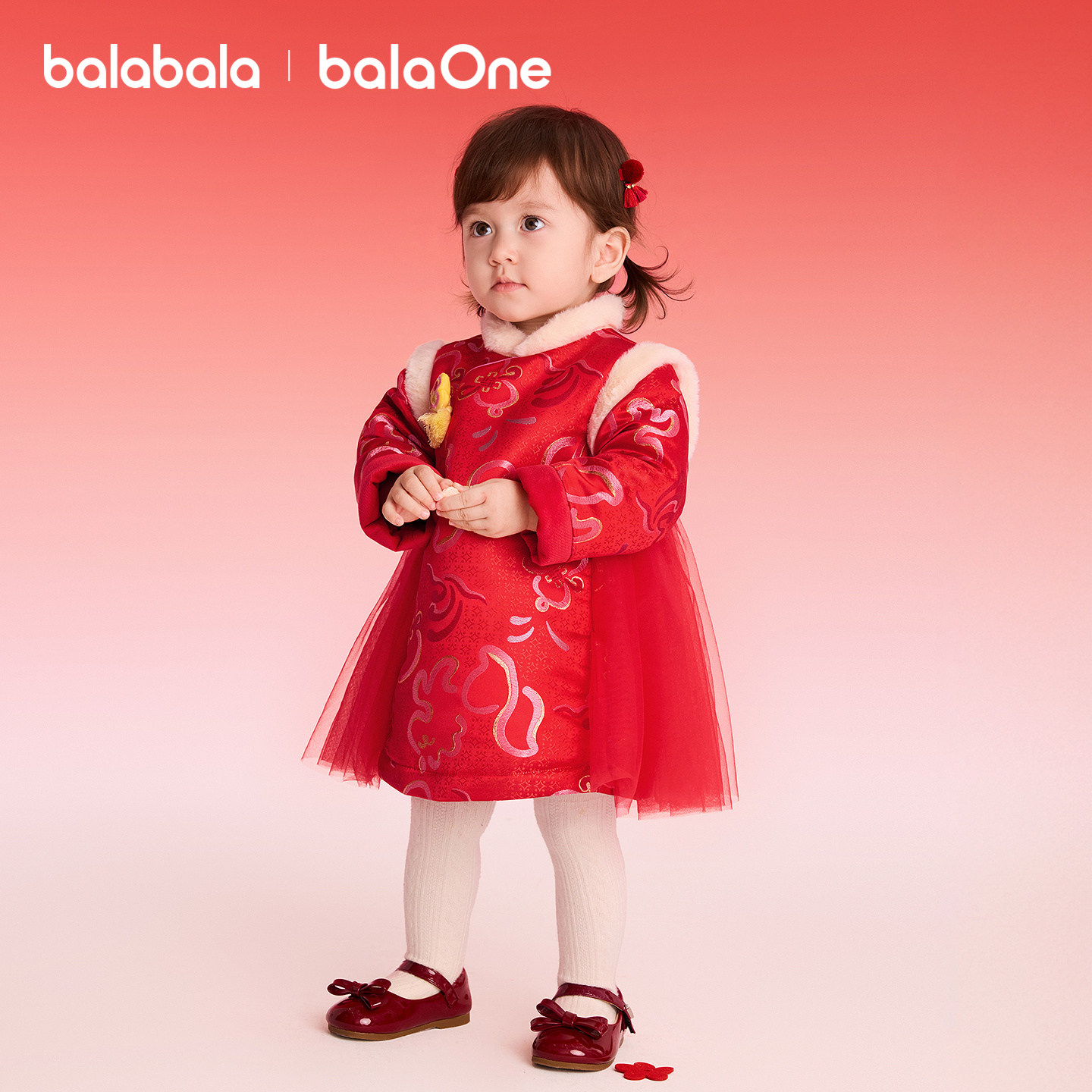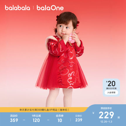 巴拉巴拉童装女童拜年服连衣裙2025秋冬装新款红色网纱新中式裙子
