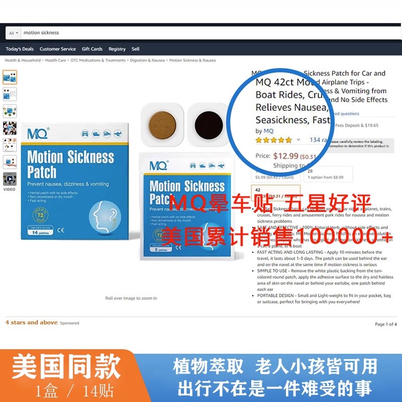美国MQ晕车贴晕车儿童成人乘车坐车呕吐眩晕户外旅行晕船晕机贴