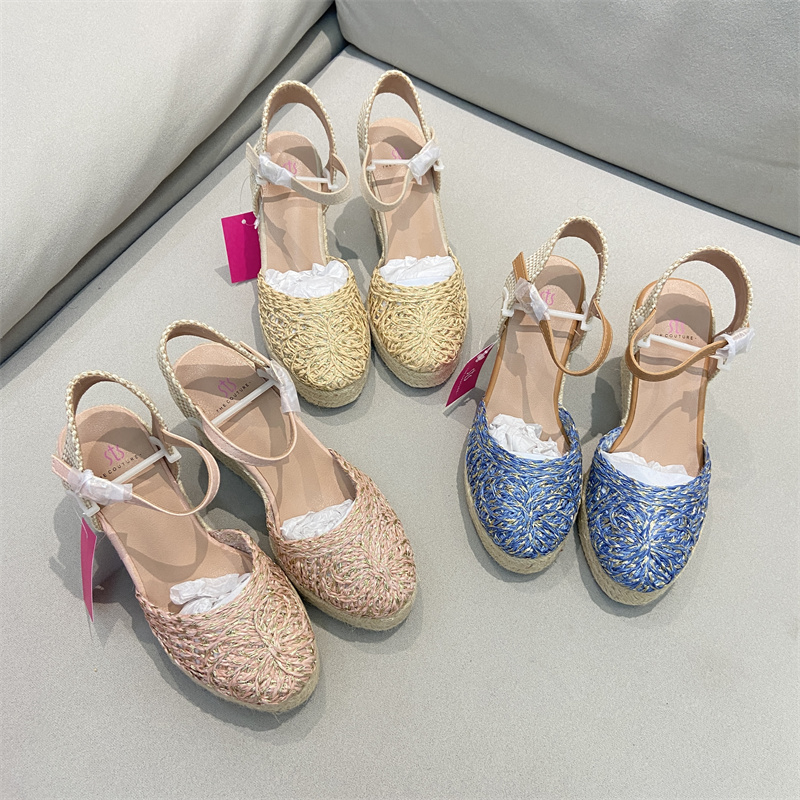 外贸单 夏季新款草编厚底坡跟包头凉鞋女高跟镂空拼色女鞋渔夫鞋