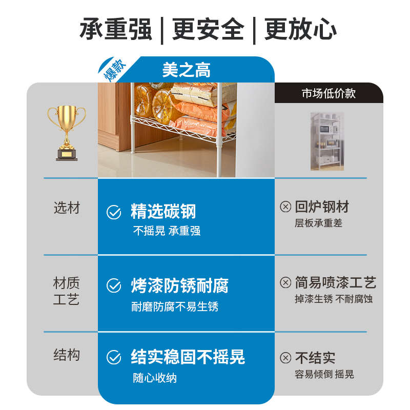 美之高厨房置物架落地多层收纳架微波炉烤箱家用白色货架储物架子