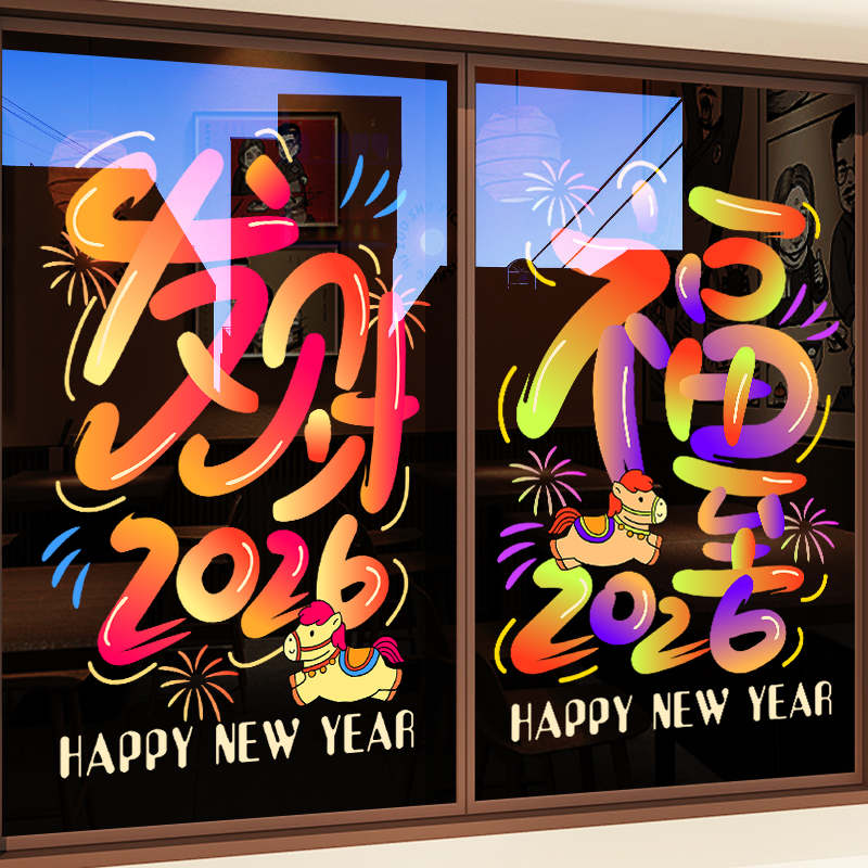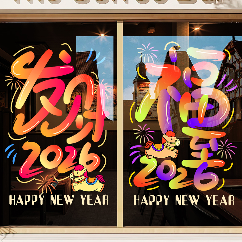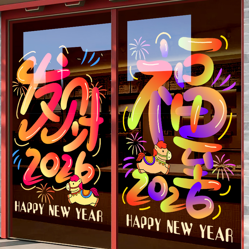 2026新年玻璃贴纸马年春节装饰发财福至过年窗花便利店元旦窗贴画