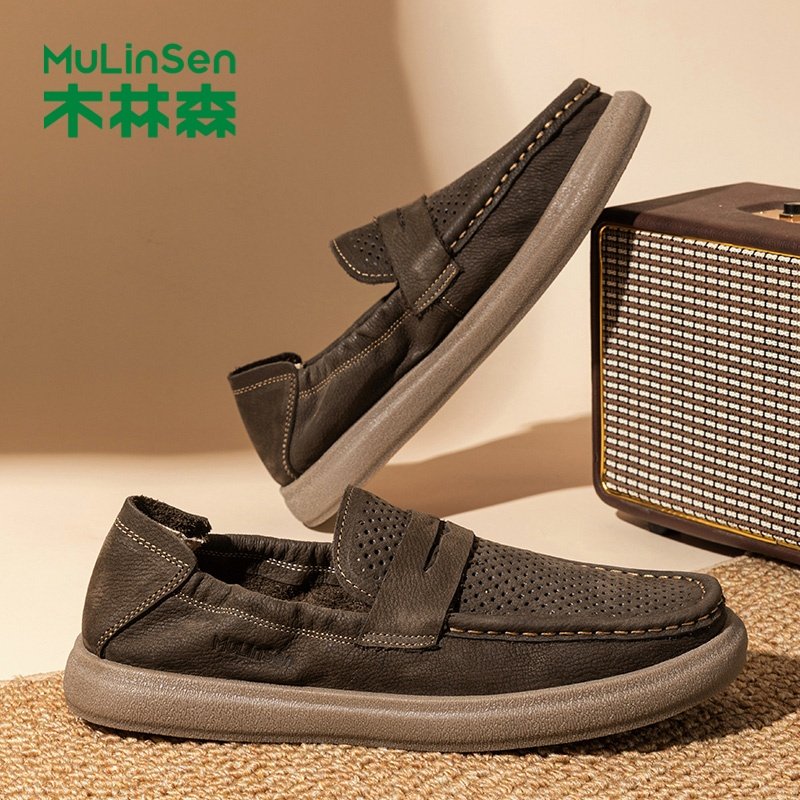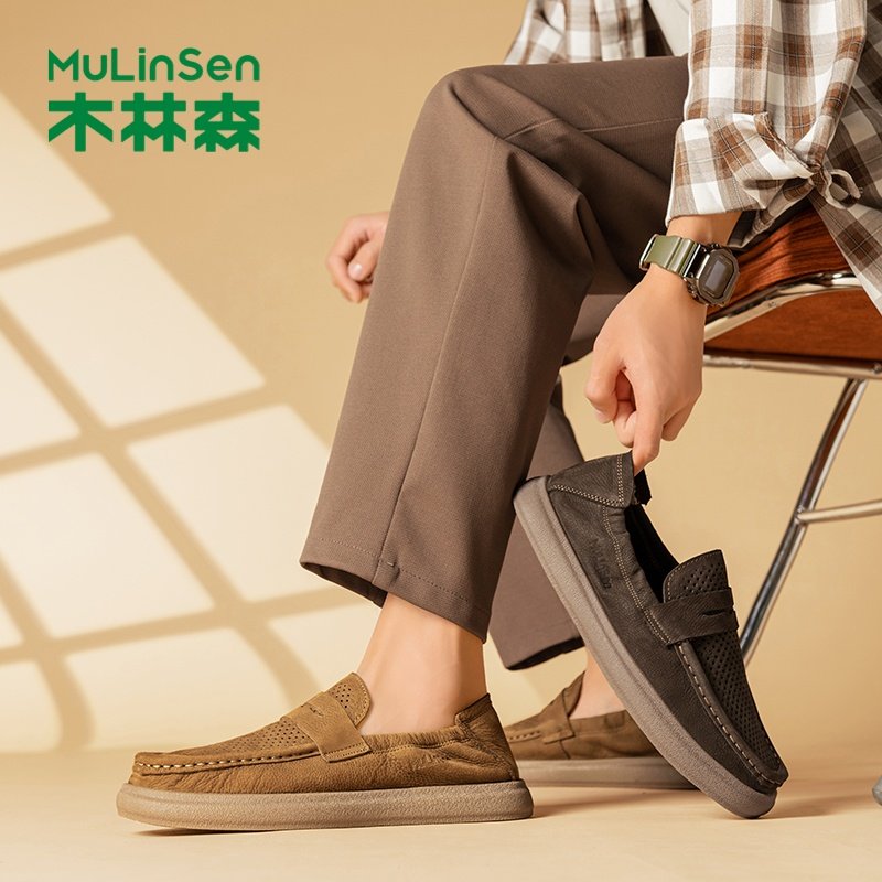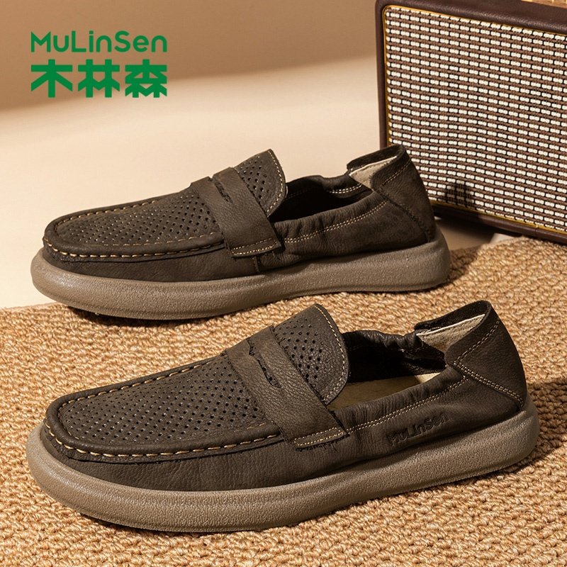 木林森时尚皮鞋男鞋夏季新款镂空透气休闲真皮英伦一脚蹬豆豆鞋