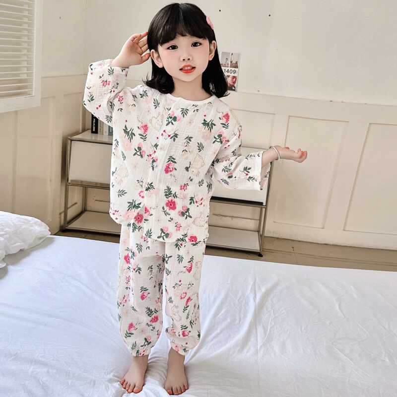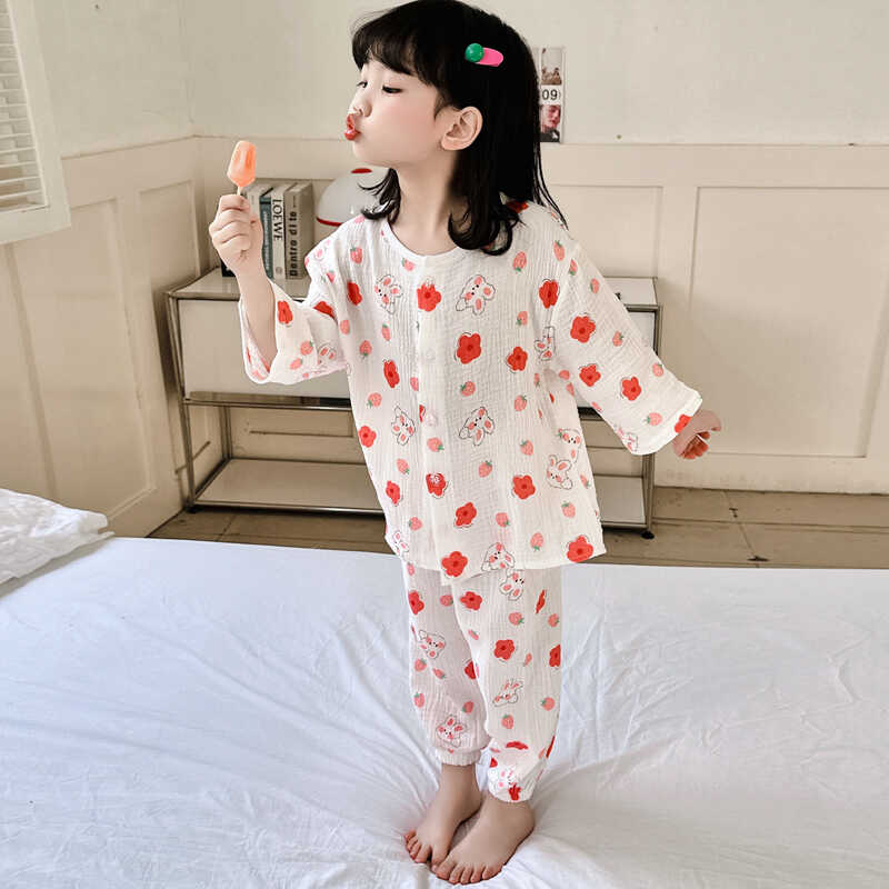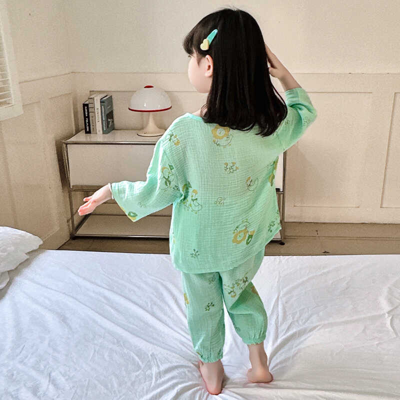 儿童夏季薄款开衫睡衣套装纯棉双层棉纱七分袖家居服女宝宝空调服