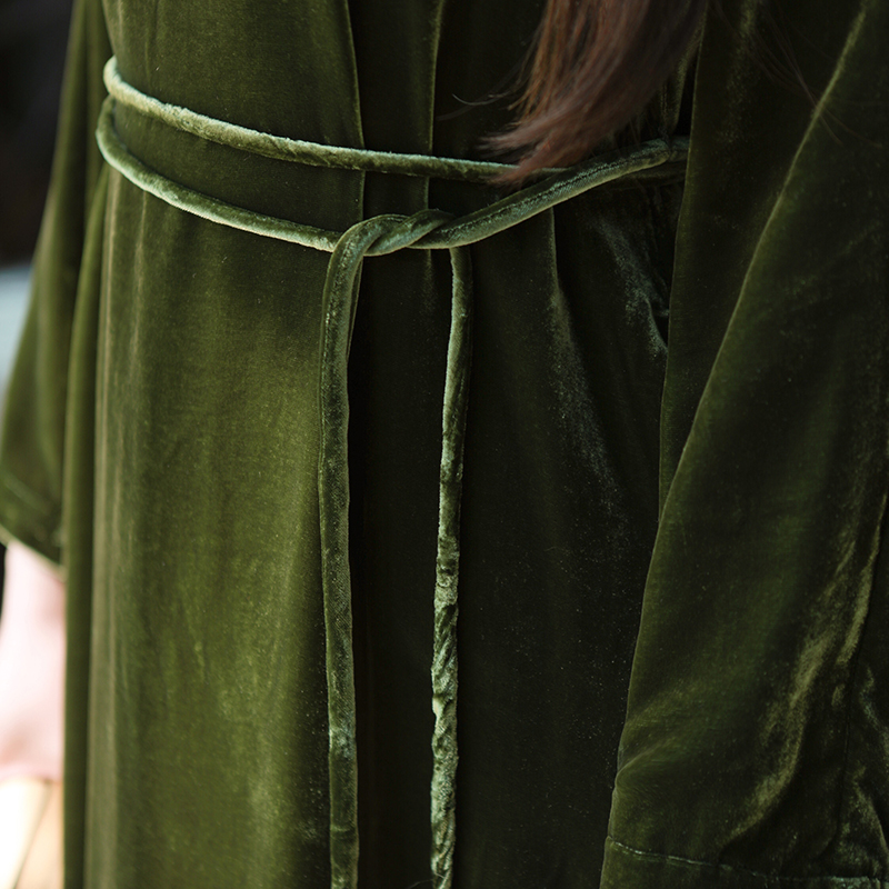 绿茵 柑香素染真丝绒手绣中式半开襟连衣裙桑蚕丝长袖新国风春夏