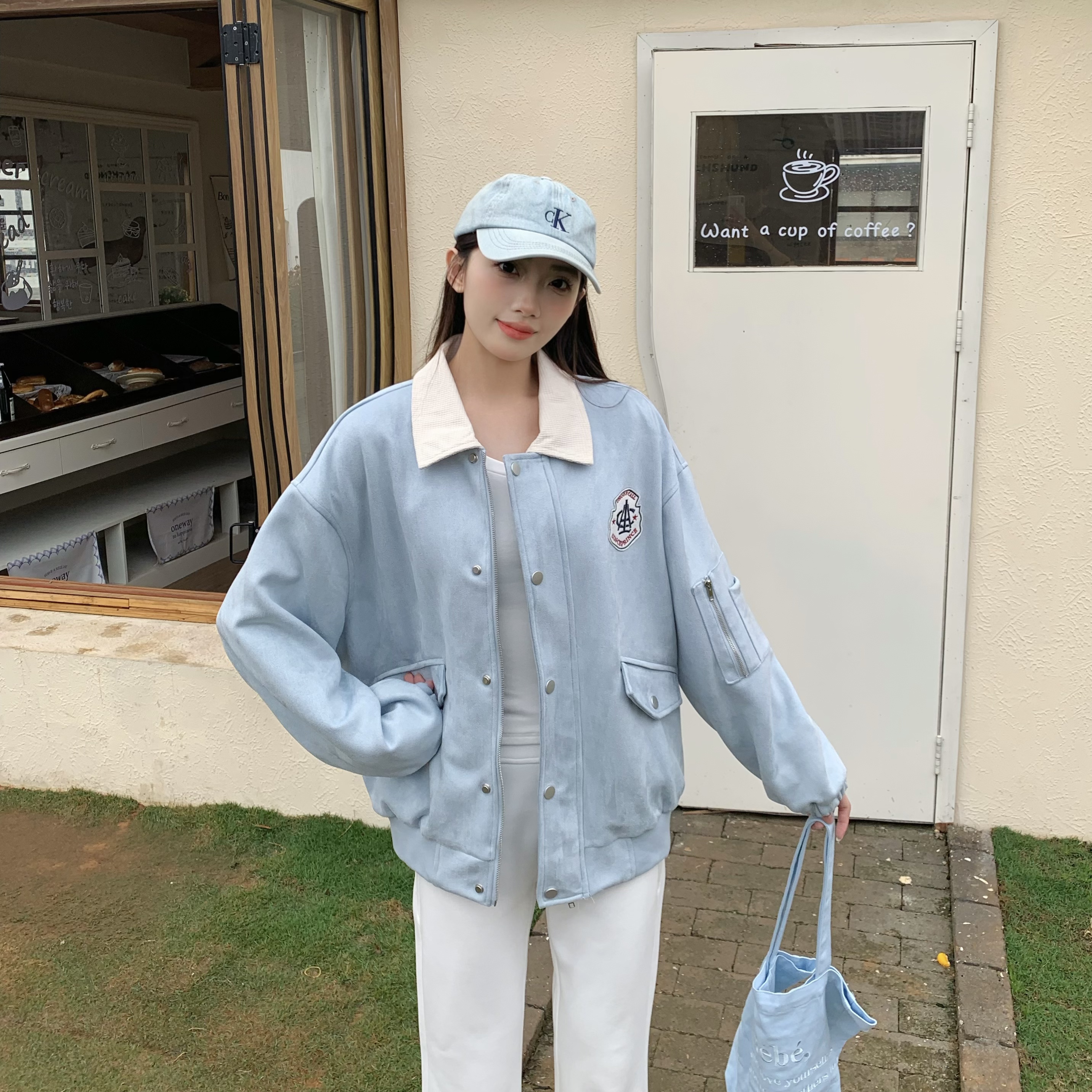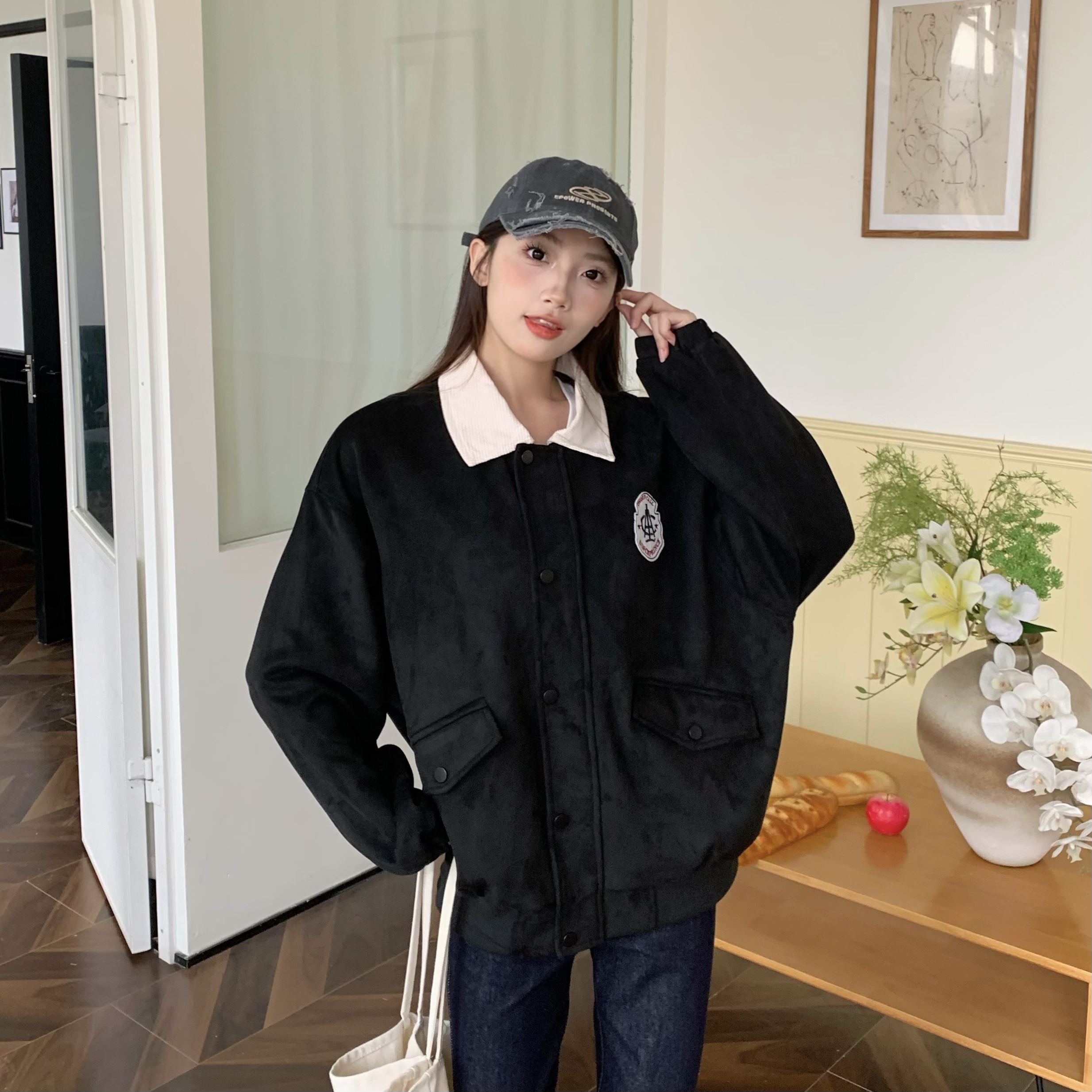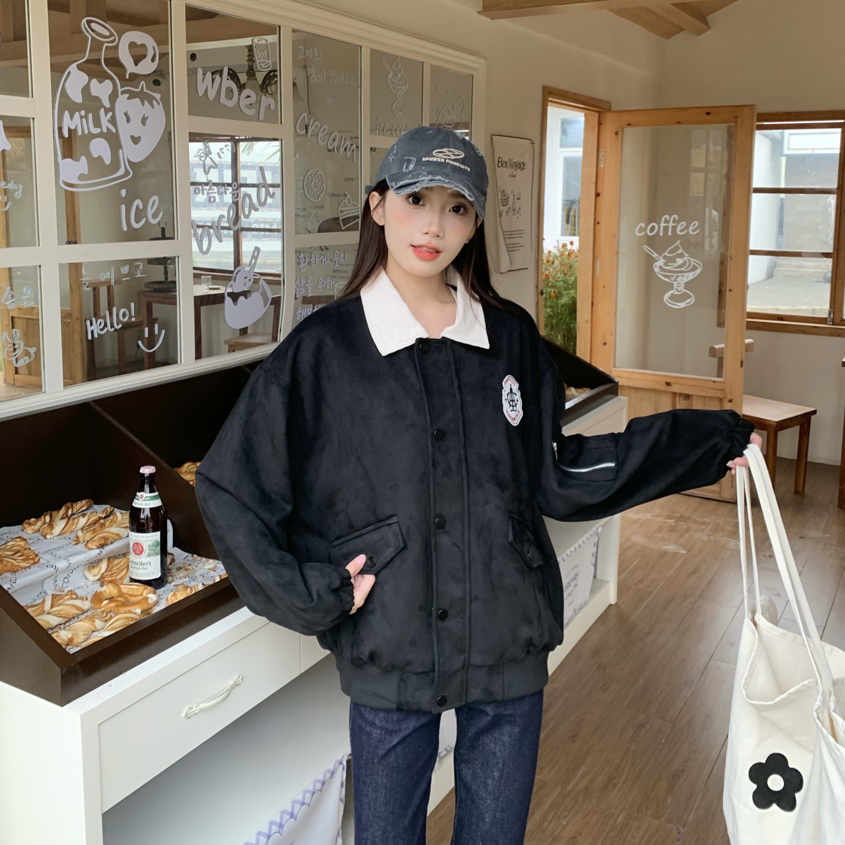 3MER哦哦三妹美式复古麂皮夹克休闲外套女宽松撞色翻领棒球服开衫