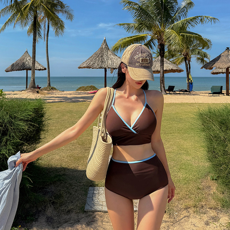 2025新款分体两件套遮肚显瘦纯色性感高腰比基尼温泉度假游泳装