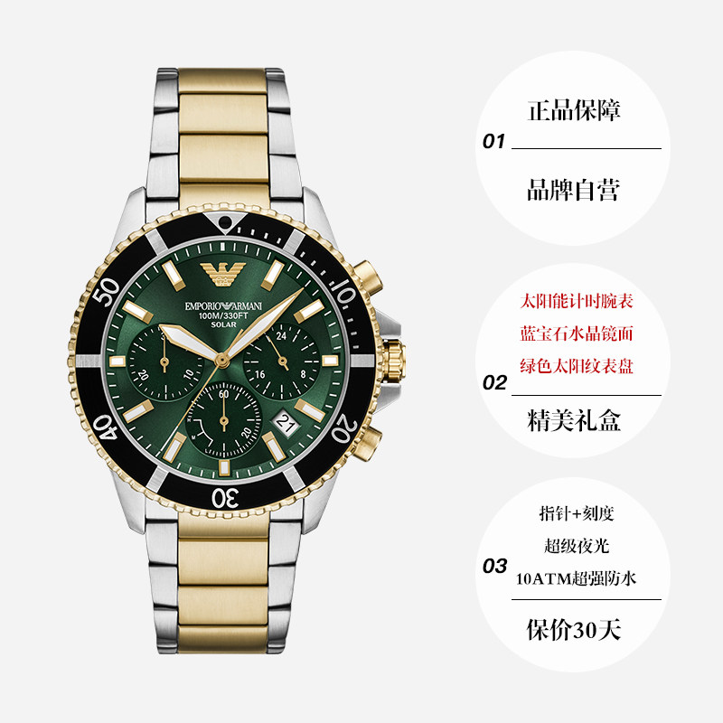 【自营】Armani阿玛尼手表男夜光计时绿色太阳能防水石英AR11695