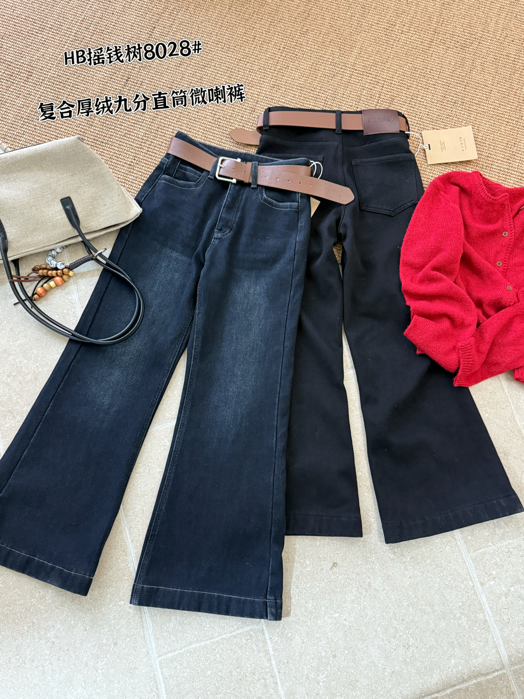 8028冬季新款韩版气质百搭显瘦加绒加厚九分直筒微喇裤休闲牛仔裤
