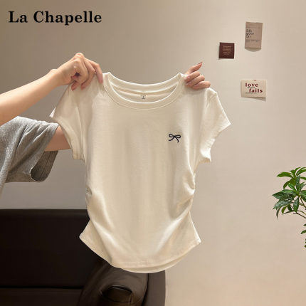 拉夏贝尔蝴蝶结刺绣正肩圆领短袖T恤女夏季褶皱收腰修身短款上衣