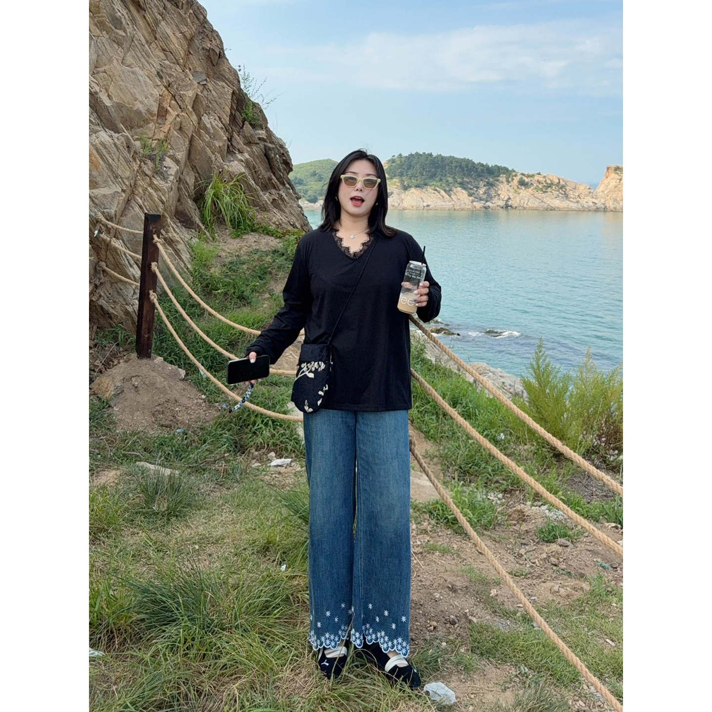 VOGANA戛纳家大码女装口碑简约纯欲风蕾丝拼接宽松显瘦长袖t恤秋