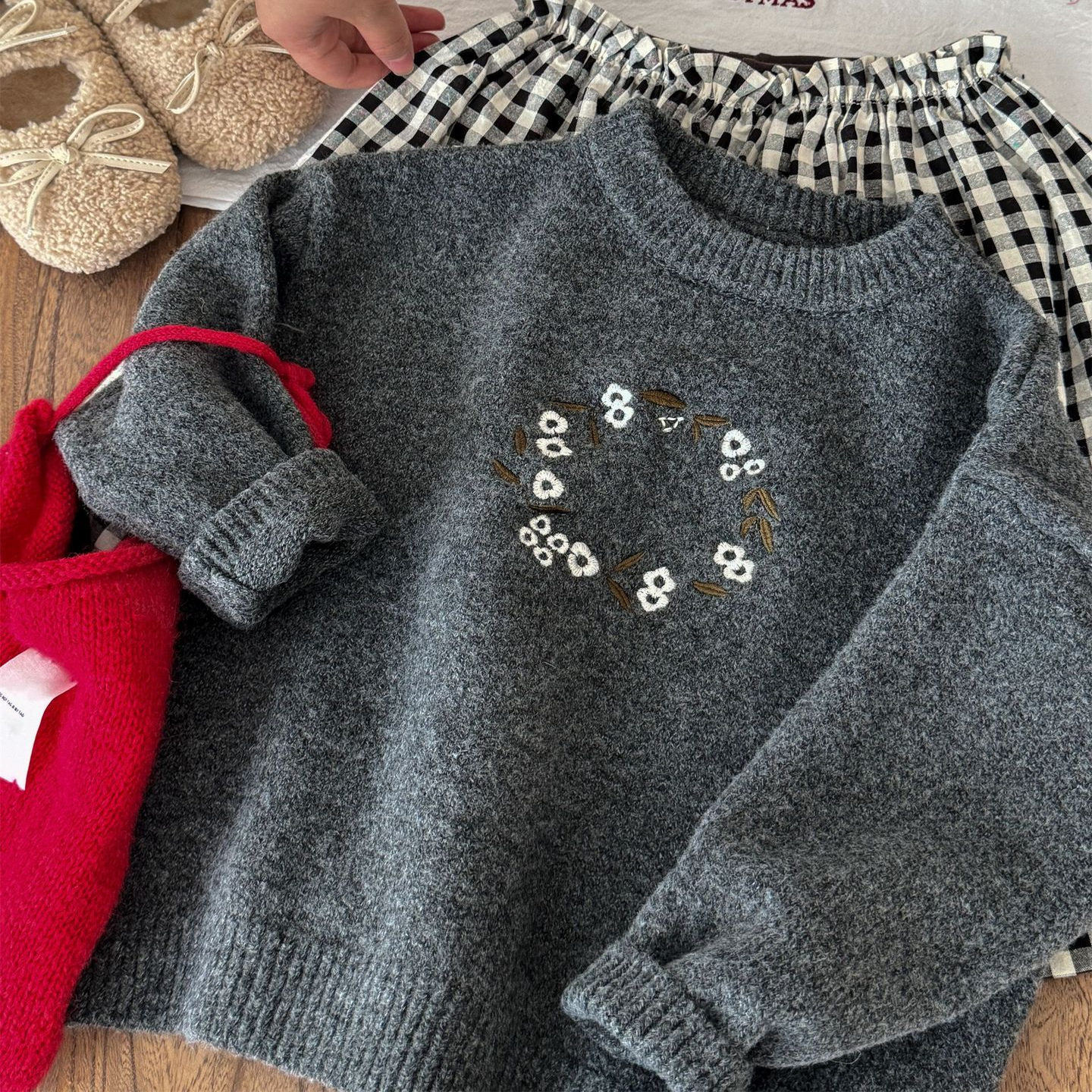 女童灰色手工刺绣花套头毛衣