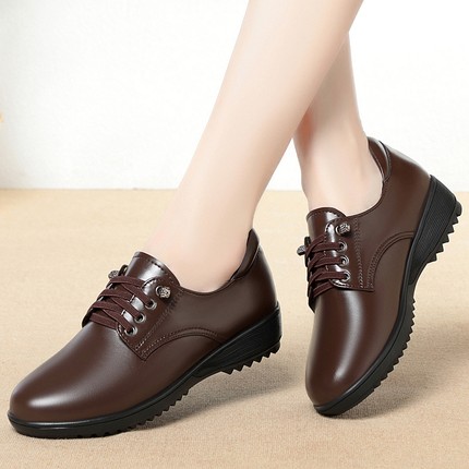 春秋单鞋女坡跟平底系带皮鞋休闲防滑软底中老年妈妈鞋上班工作鞋