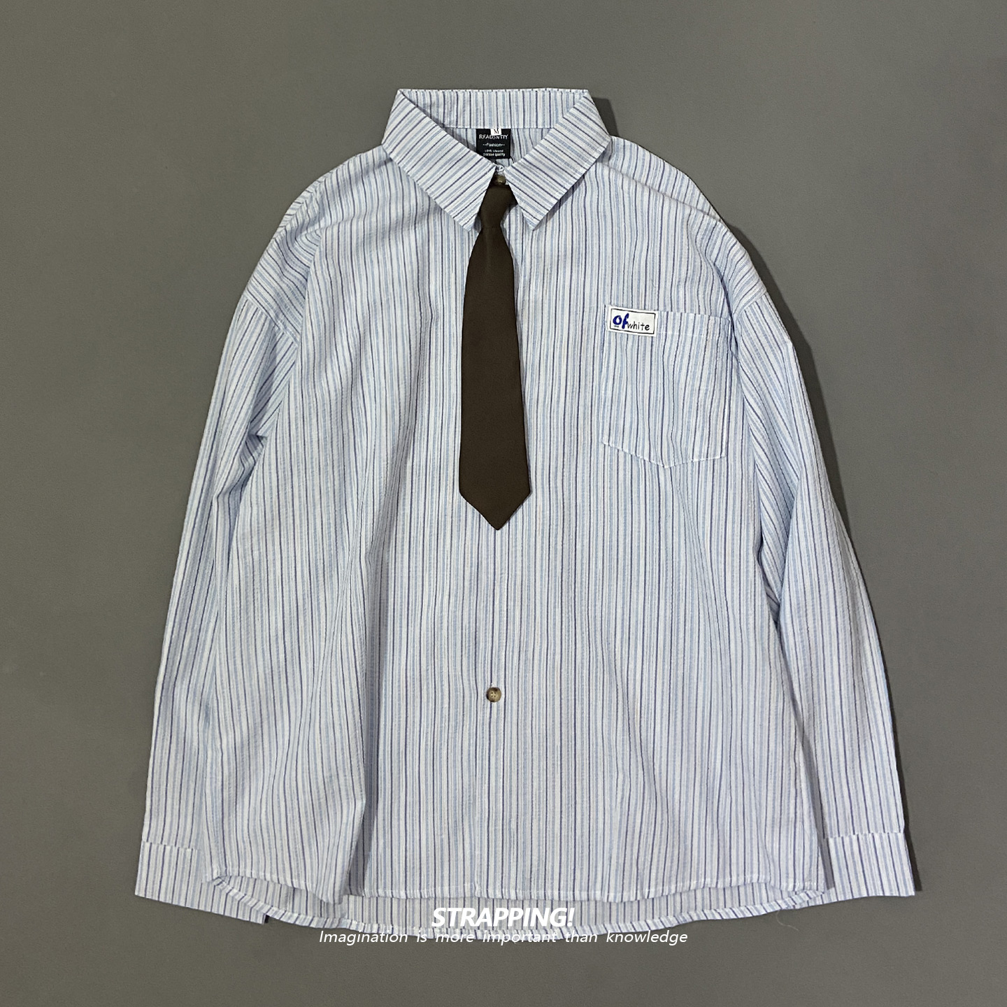 STRAPPING竖条纹领带棉质INS学院风长袖衬衫港风复古日系男女春秋
