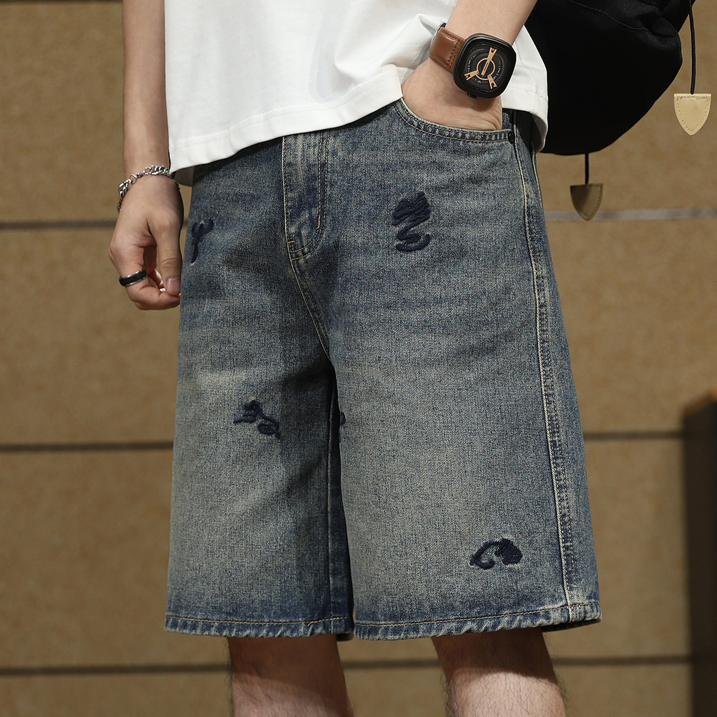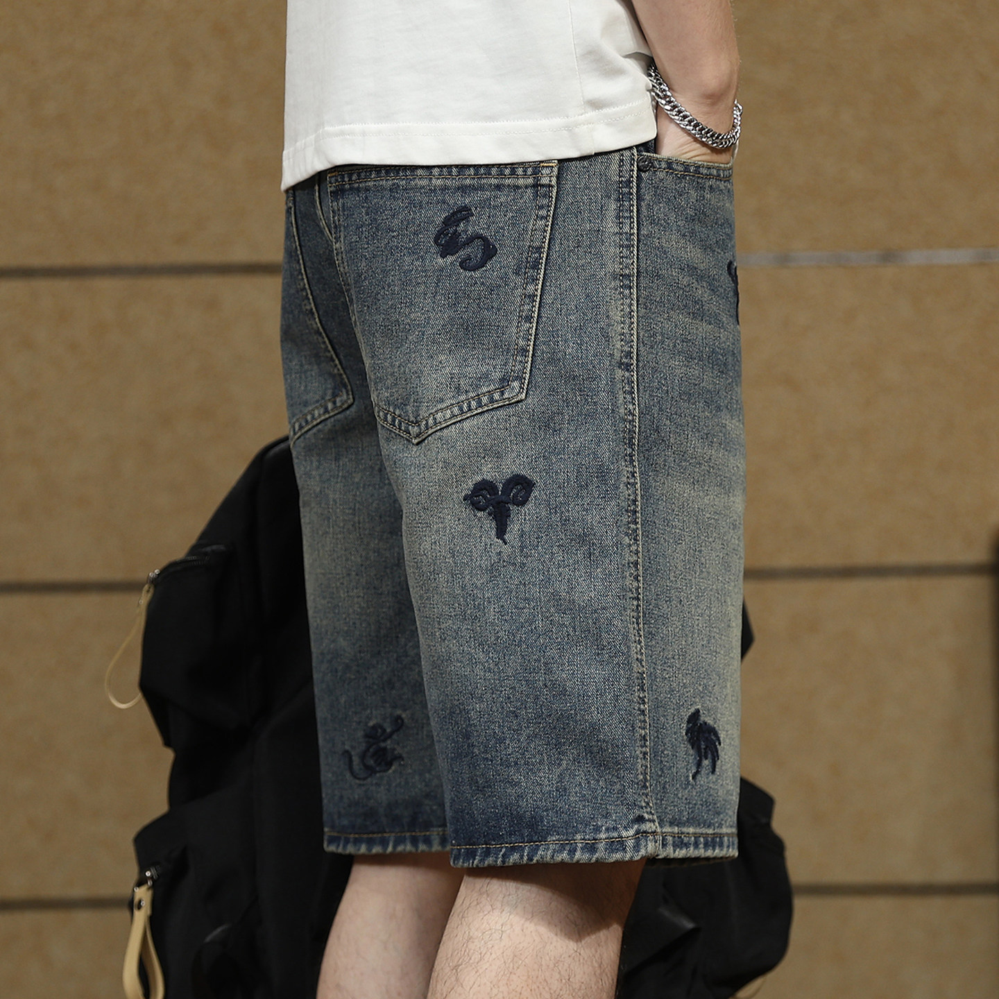 刺绣牛仔短裤男潮牌宽松大码美式复古水洗直筒痞帅五分裤夏季薄款