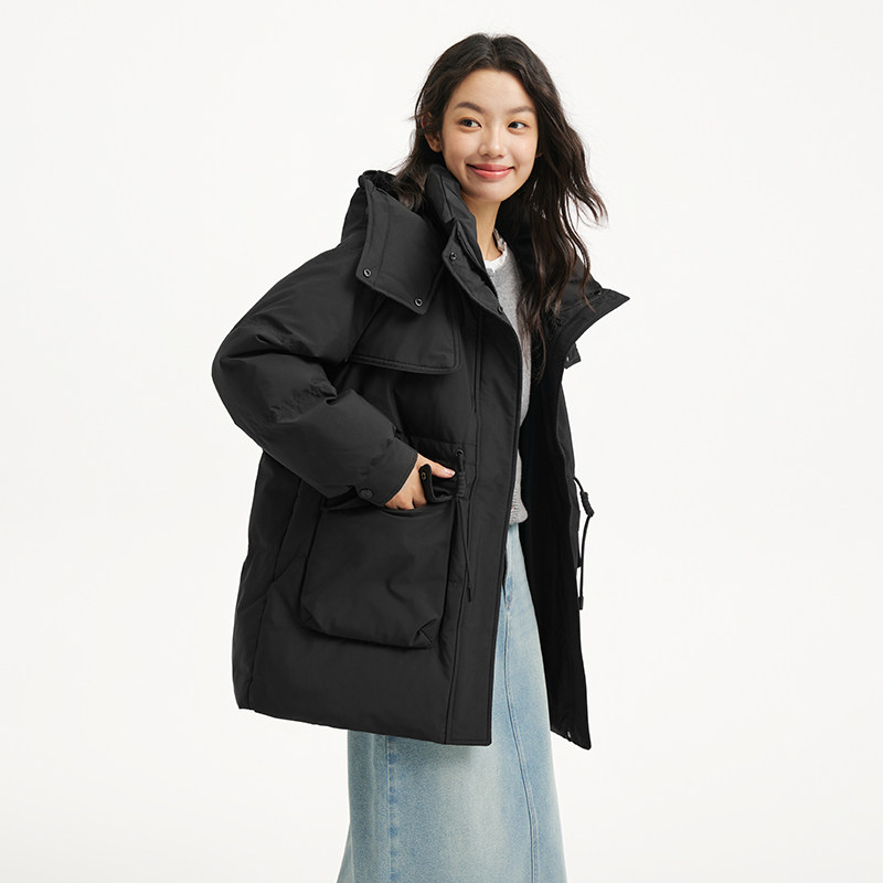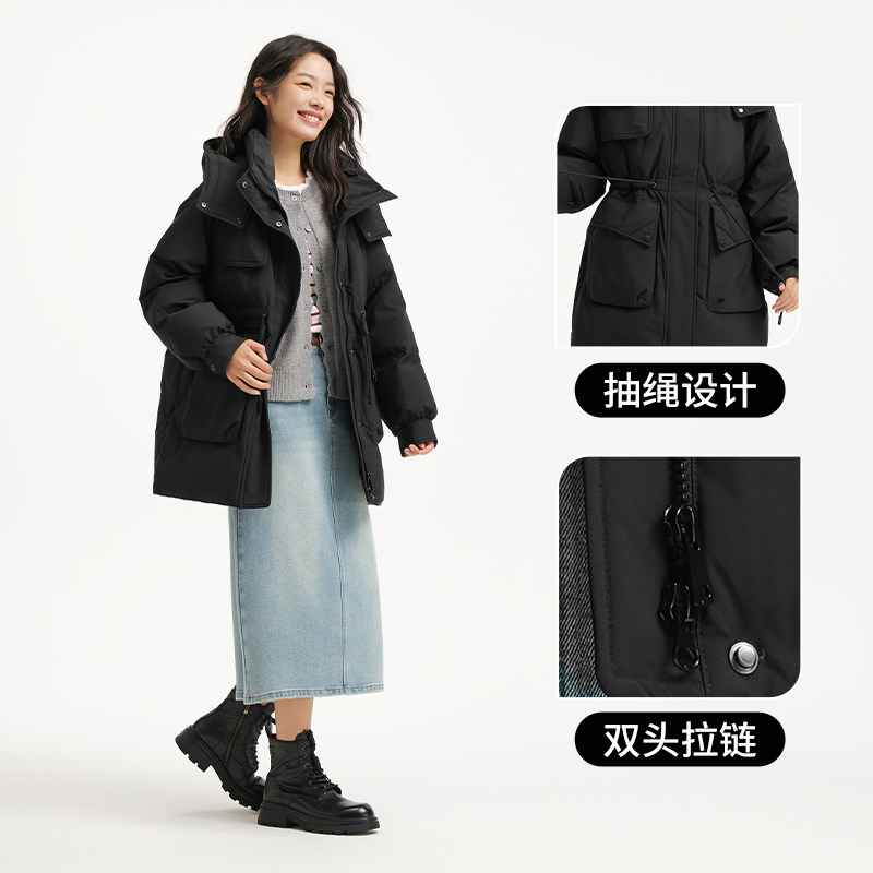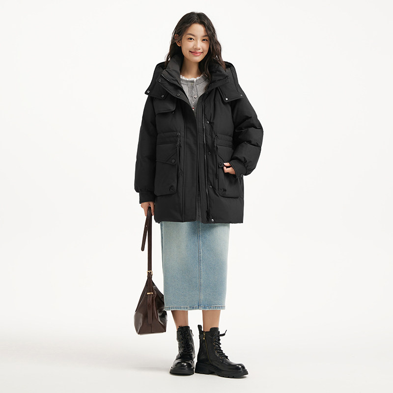 热风女士工装风羽绒服2025年冬季新款时尚收腰显瘦连帽户外羽绒服