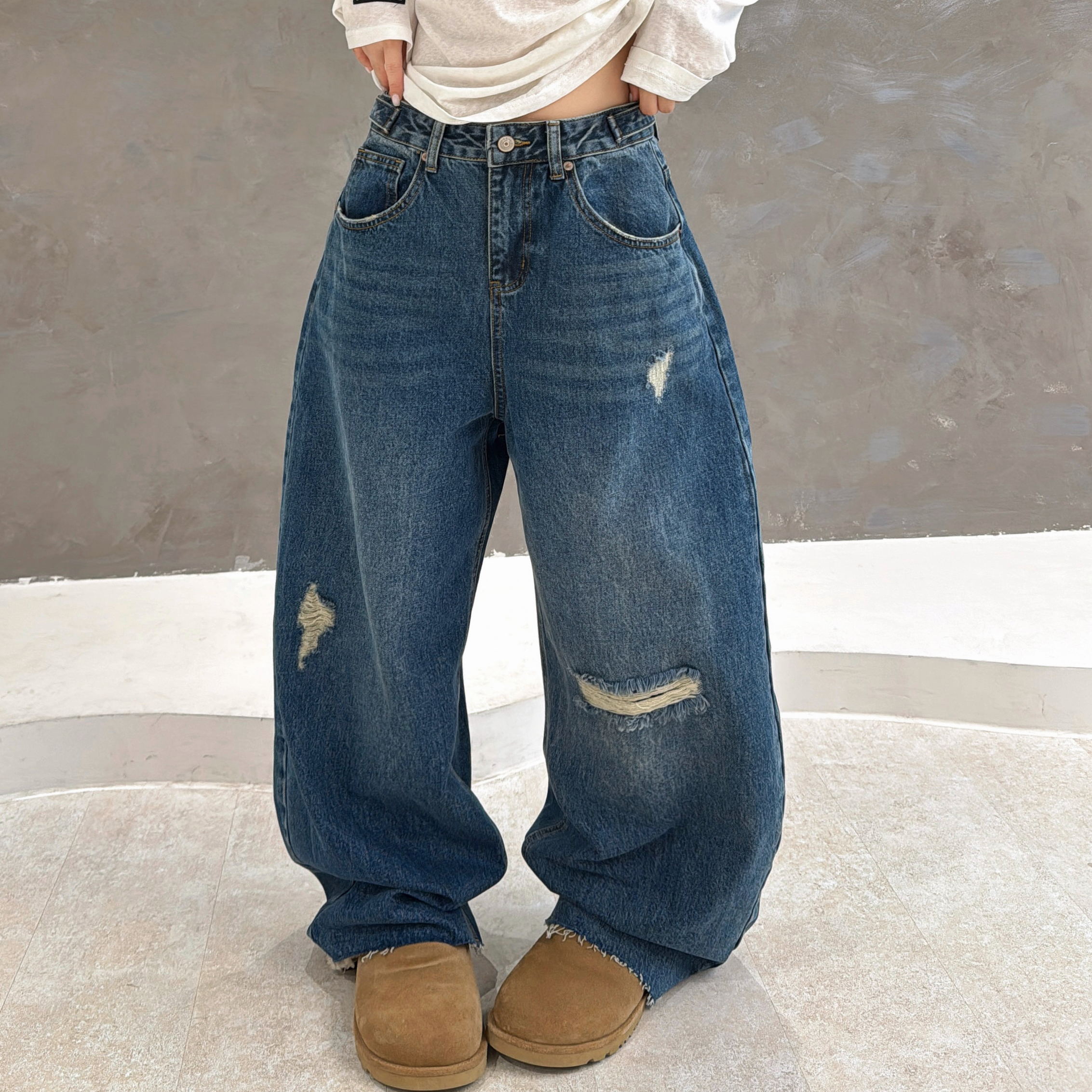 欧洲站2025冬季新款高腰侧扣咖色定标做旧磨破牛仔裤拉绒弯刀裤潮
