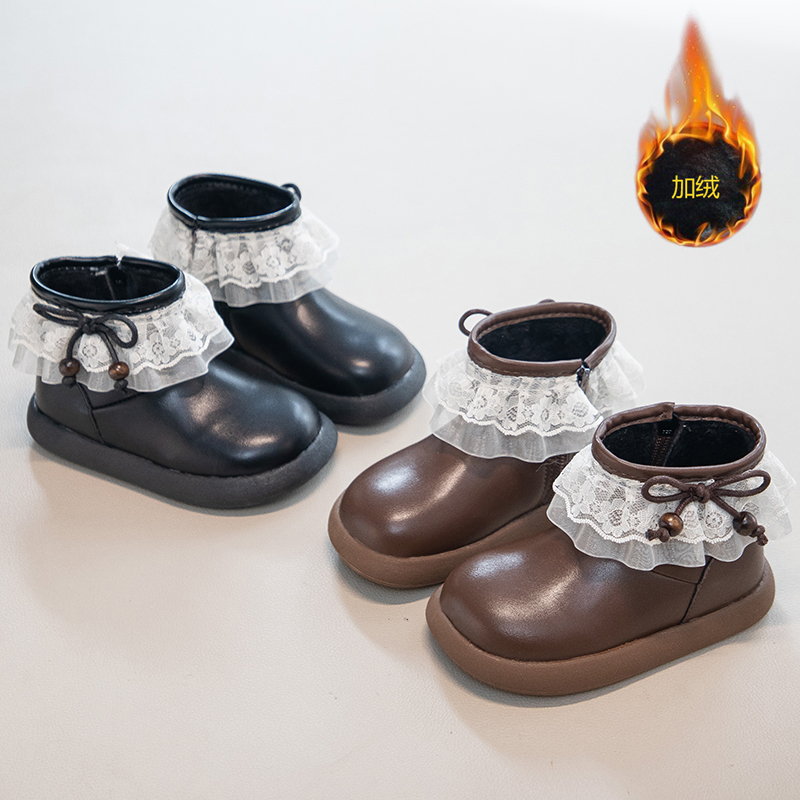 女童皮靴加绒保暖蕾丝2025秋冬季新款儿童靴子公主短靴中小童棉靴