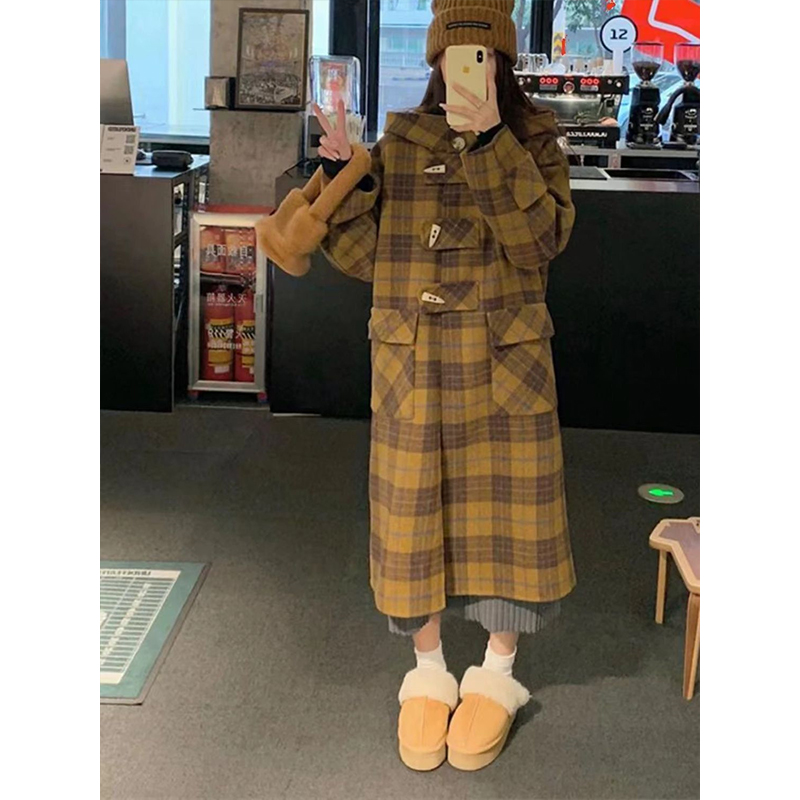 秋冬连帽牛角扣格子双面羊绒大衣女中长款小个子学院风羊毛呢外套
