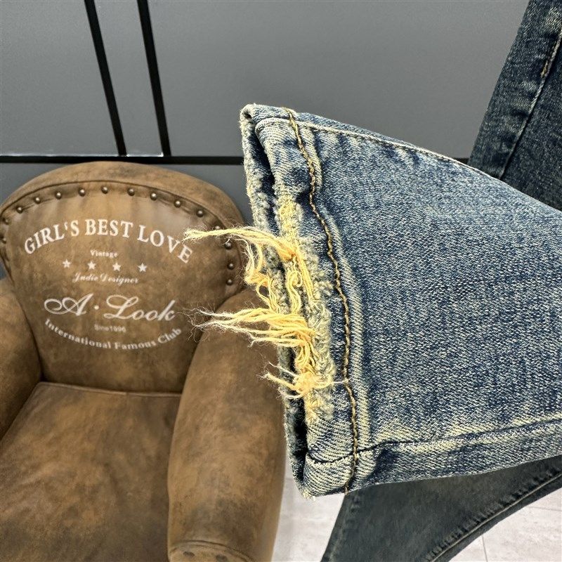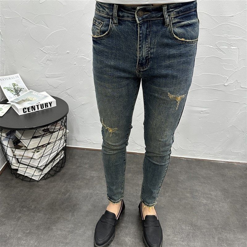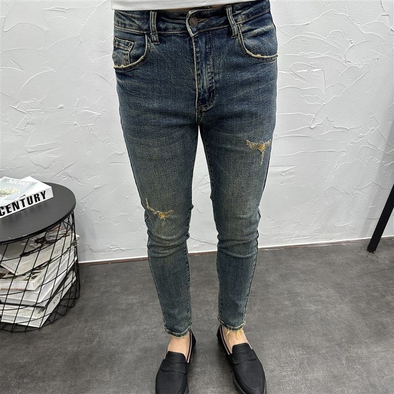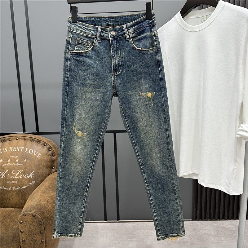 2023秋冬男新款做旧蓝水洗破洞弹力修身小脚牛仔长裤潮流休闲百搭