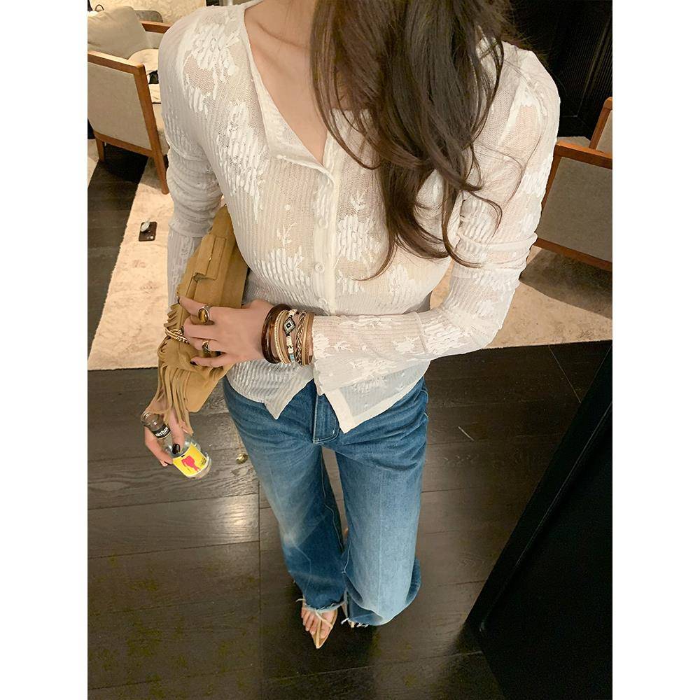 龙喜儿 薄款独特漂亮白色高弹针织开衫女蕾丝防晒空调衫春装外套