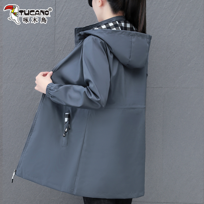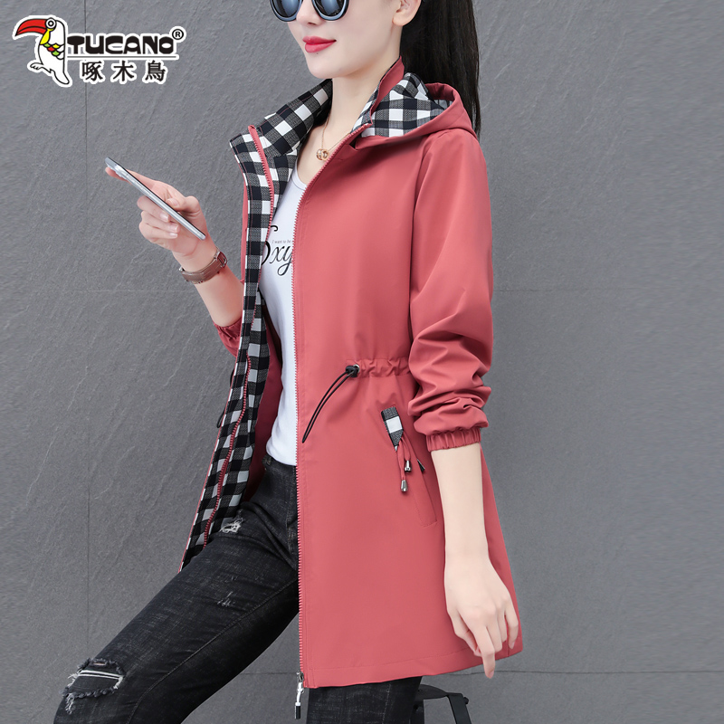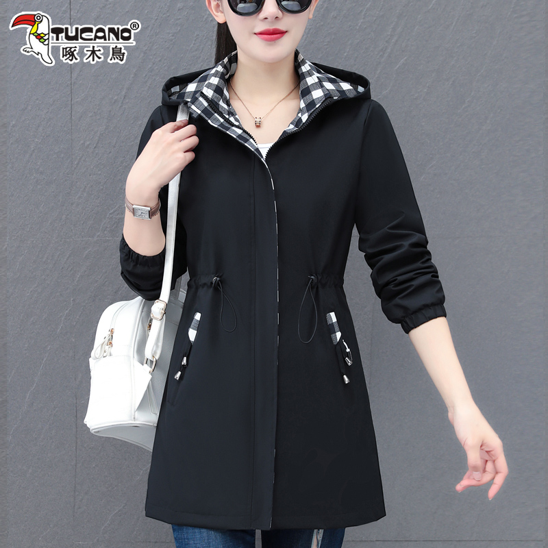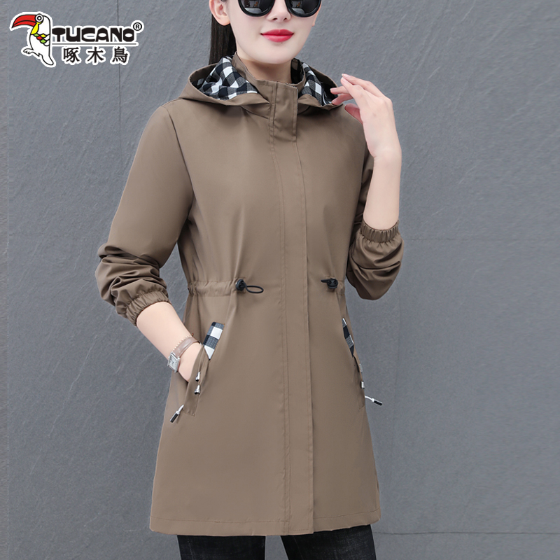 啄木鸟中长款外套收腰连帽风衣女