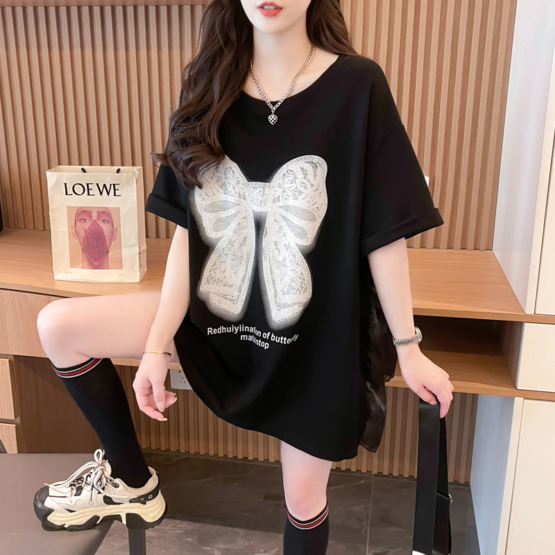 设计感中长款短袖T恤女2025夏季新款宽松百搭打底衫上衣蝴蝶结潮