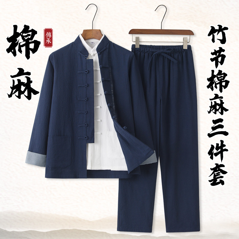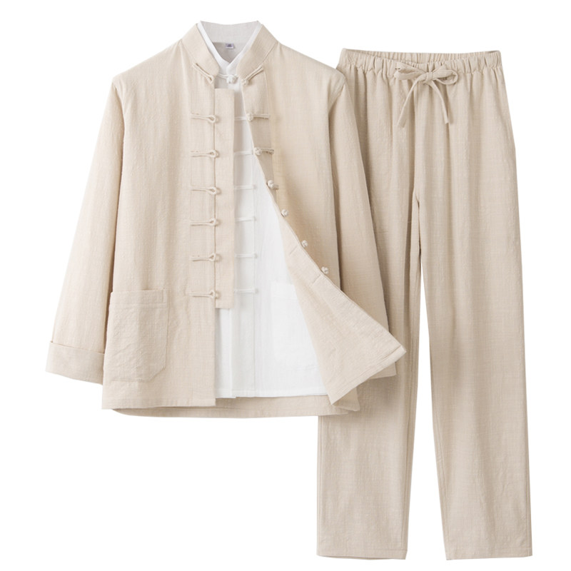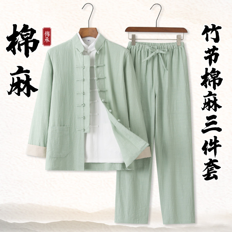 棉麻唐装男长袖套装中国风复古汉服亚麻中式男装宽松禅修太极服茶