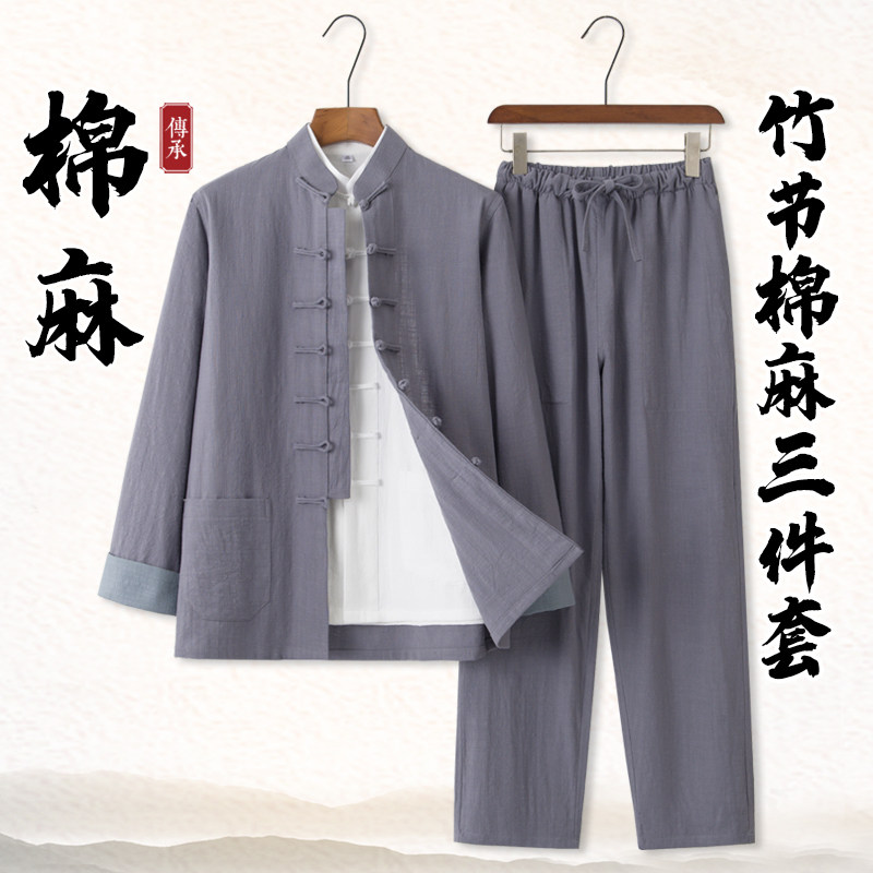 棉麻唐装男长袖套装太极服茶服汉