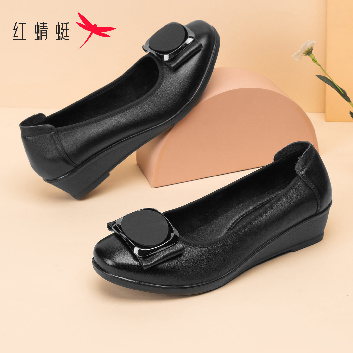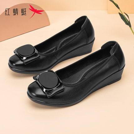 红蜻蜓妈妈鞋真皮软底2026新款坡跟中老年舒适不累脚一脚蹬女单鞋