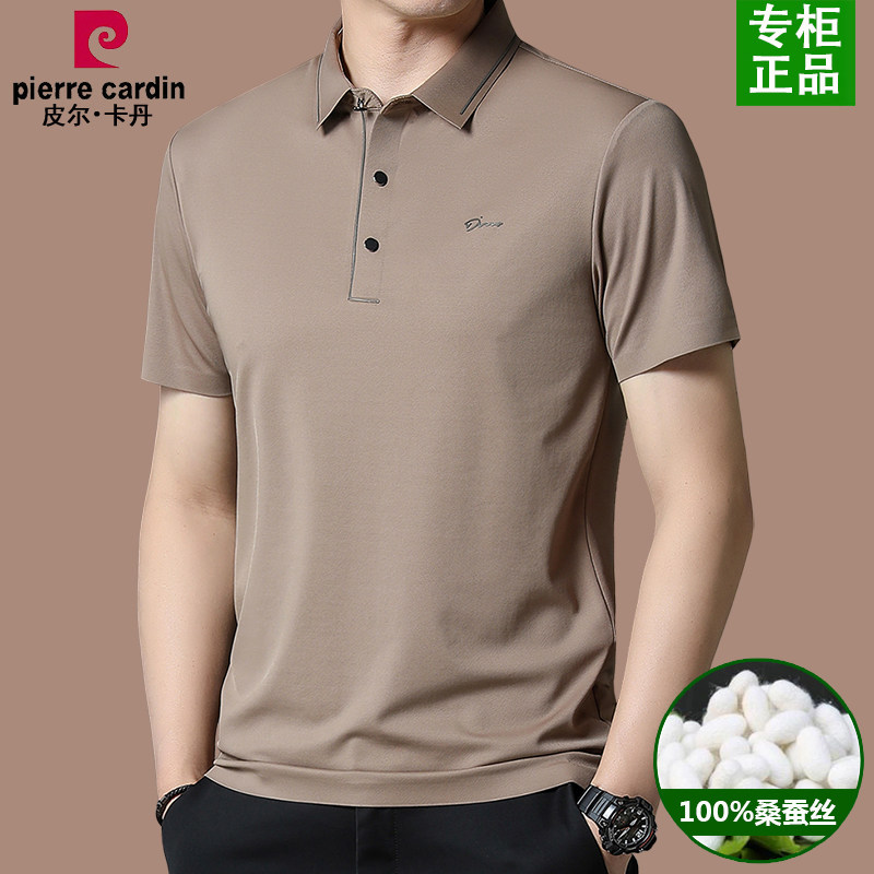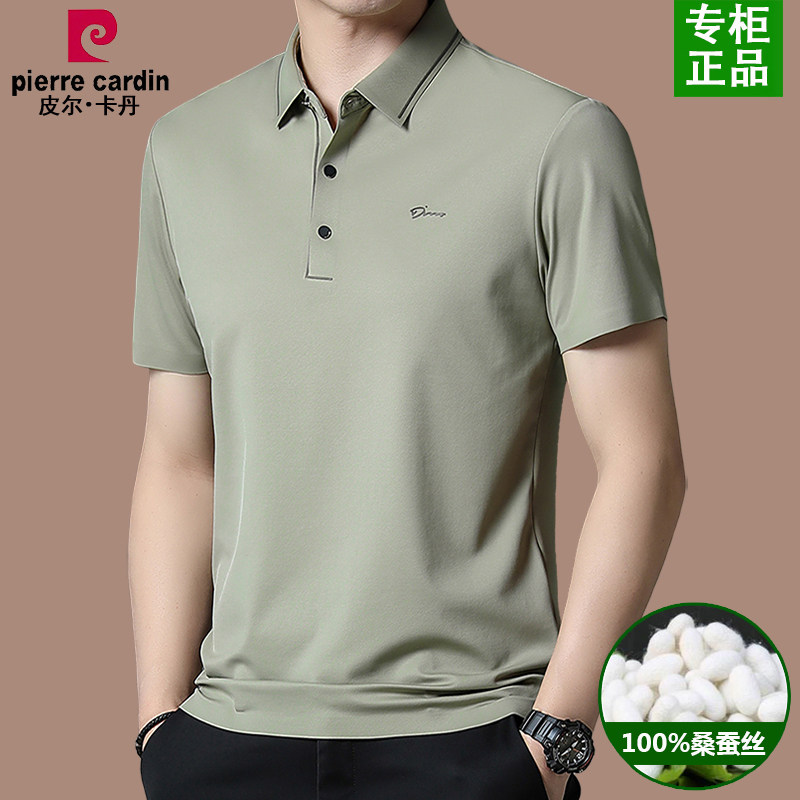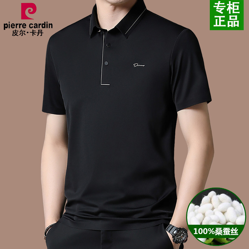 皮尔卡丹100%桑蚕丝短袖t恤男夏季冰丝翻领polo衫中年男装上衣薄
