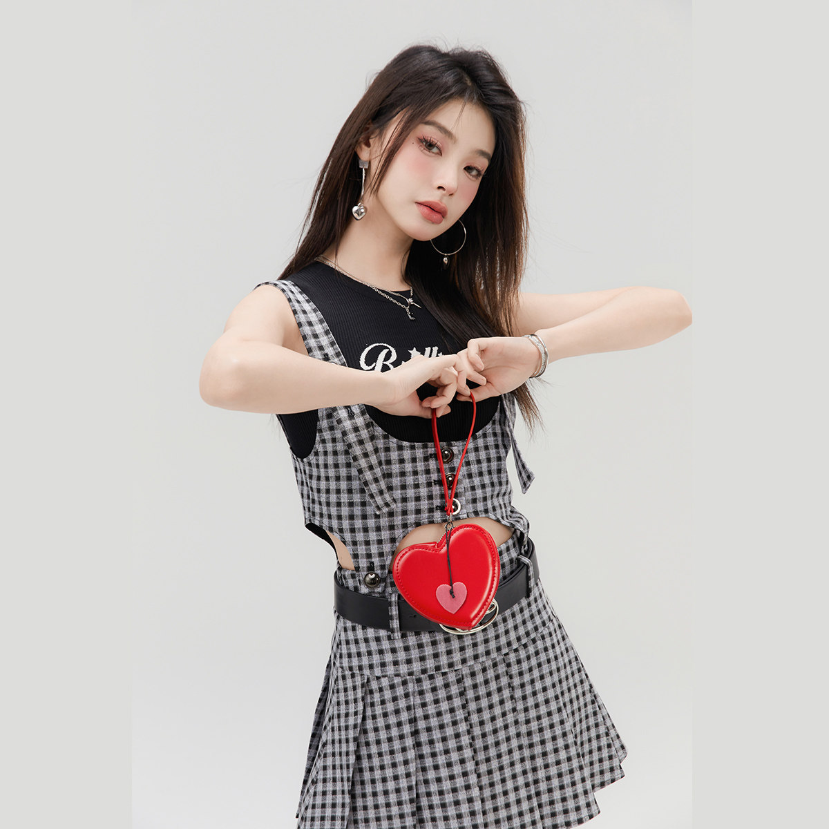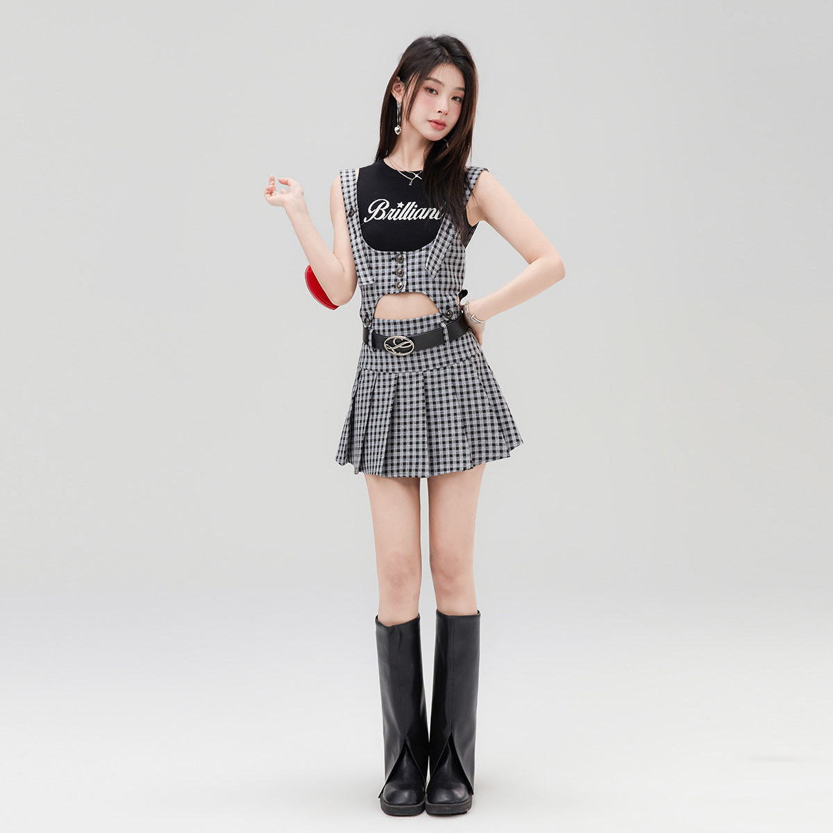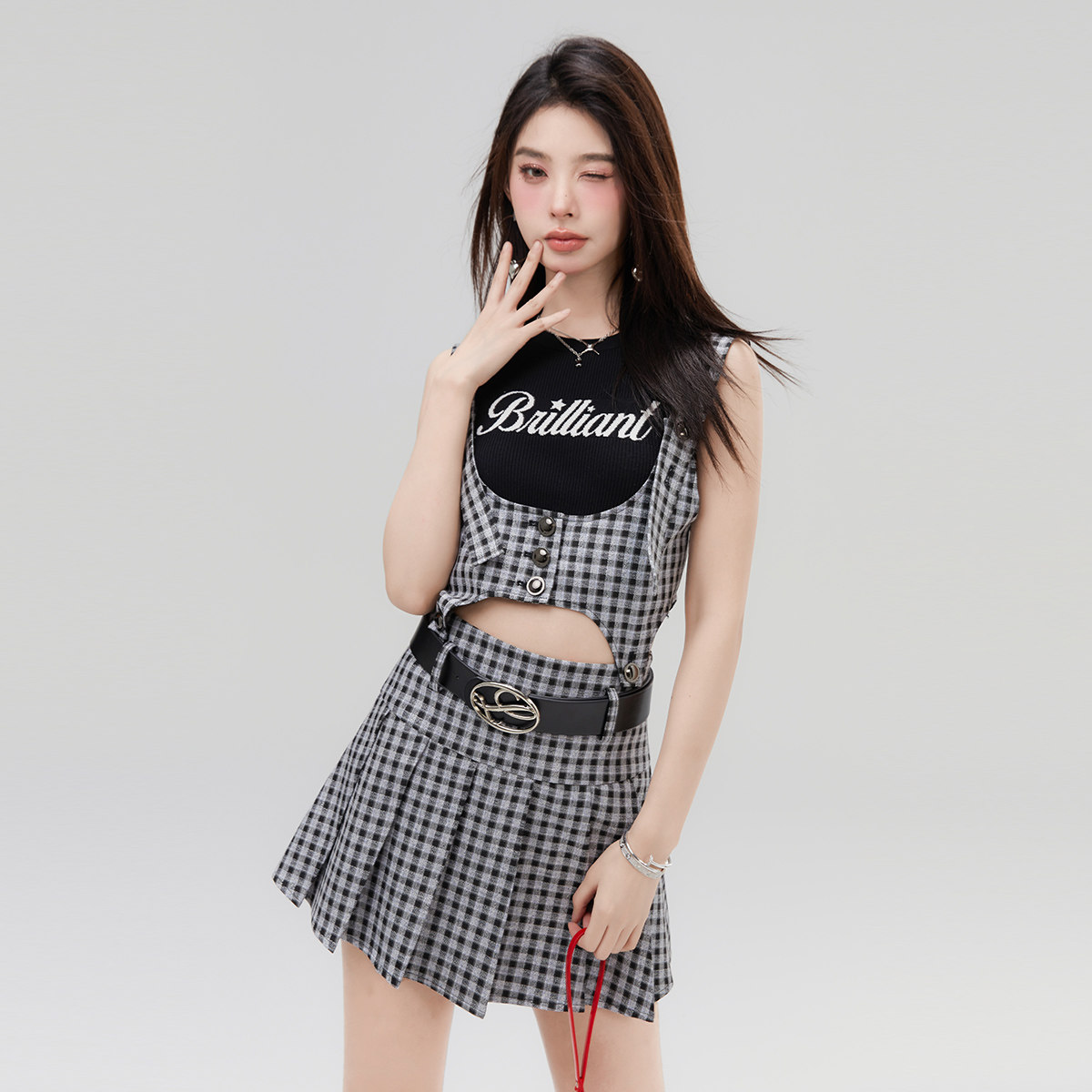 LA CRAWFISH韩系学院风辣妹镂空格子显瘦可拆卸背带两穿连衣裙女