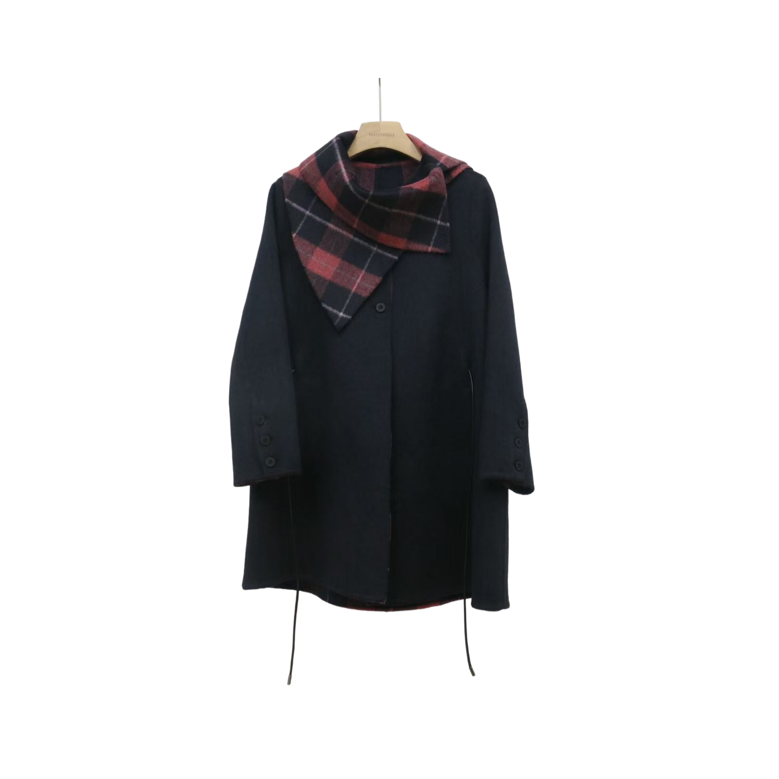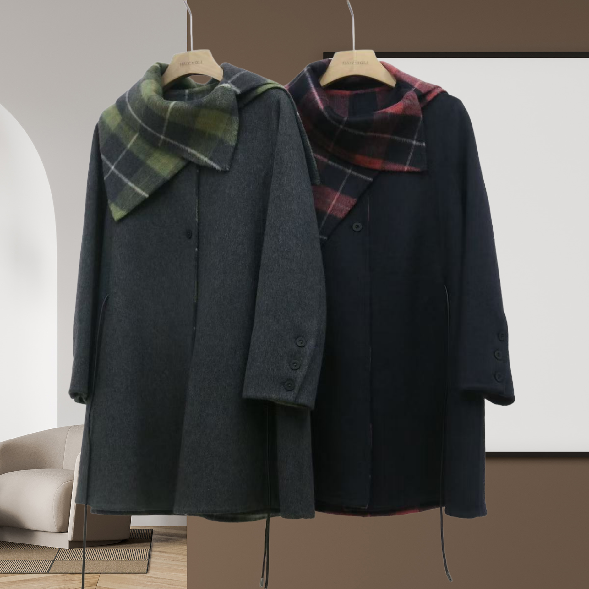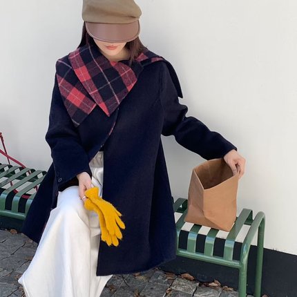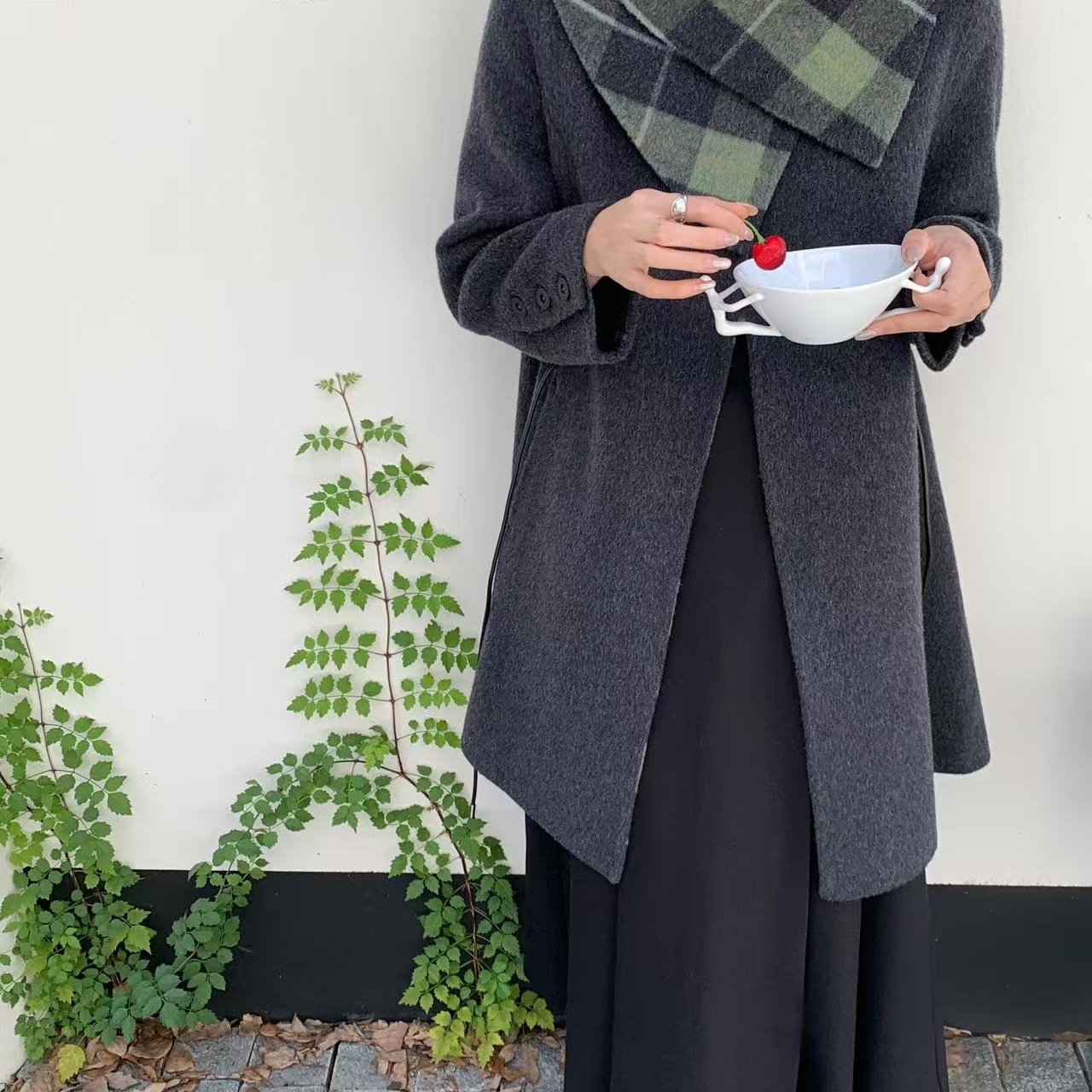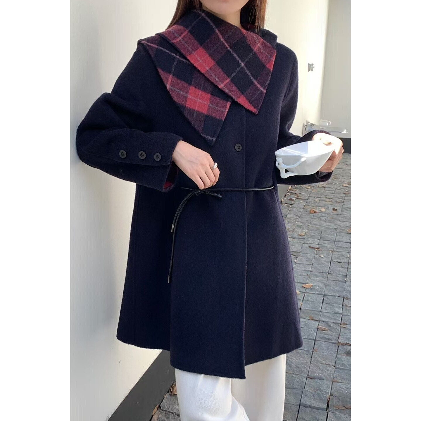 025新品双面呢羊毛大衣女可拆格纹领中长款系带正肩A字腰毛呢外套