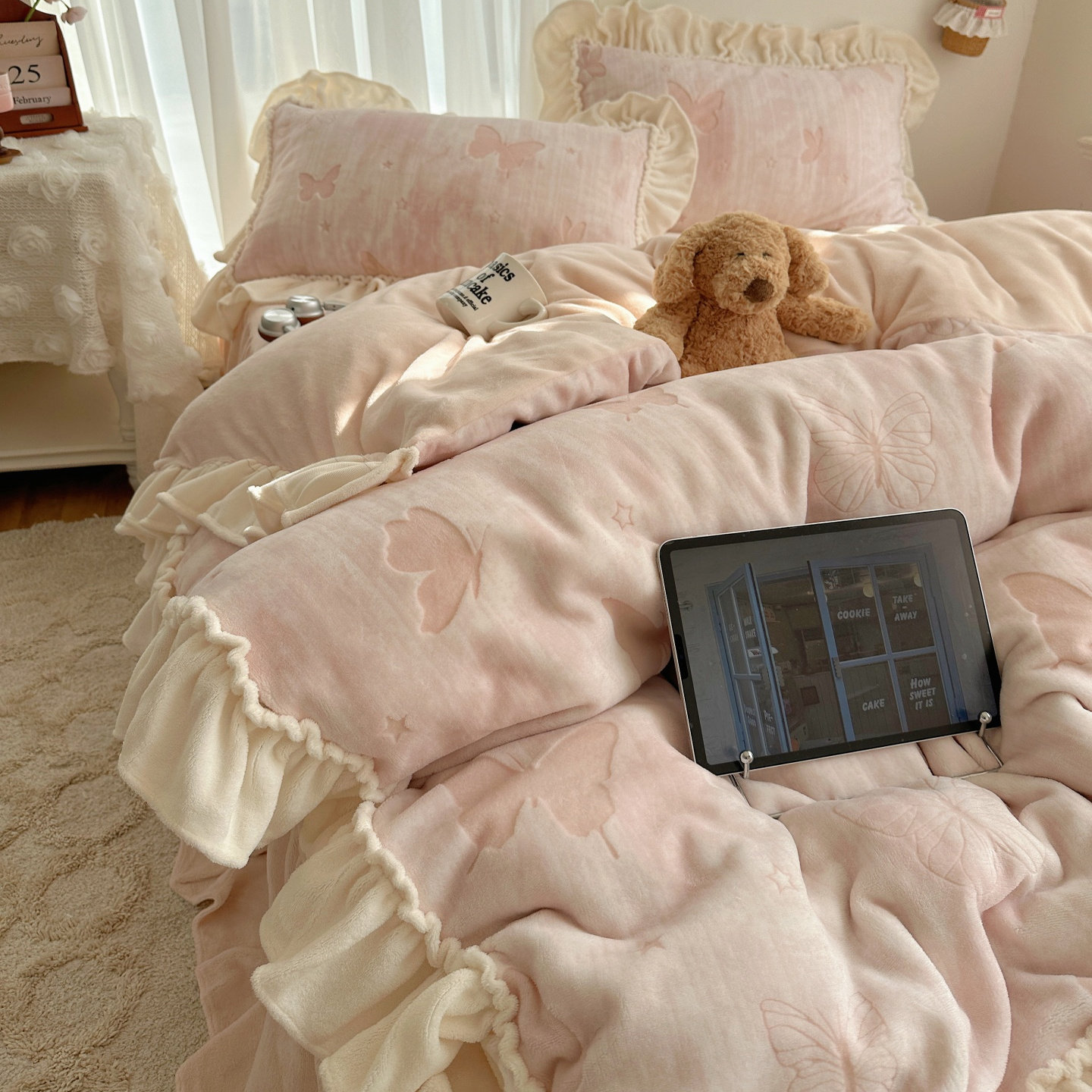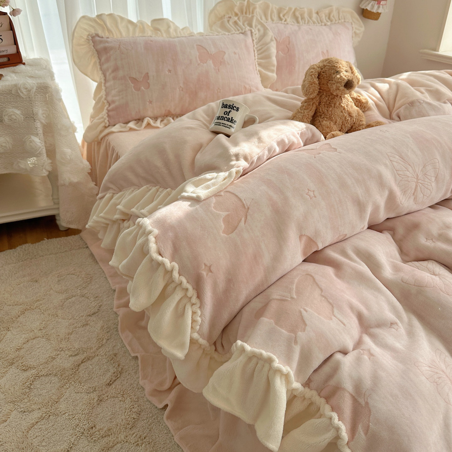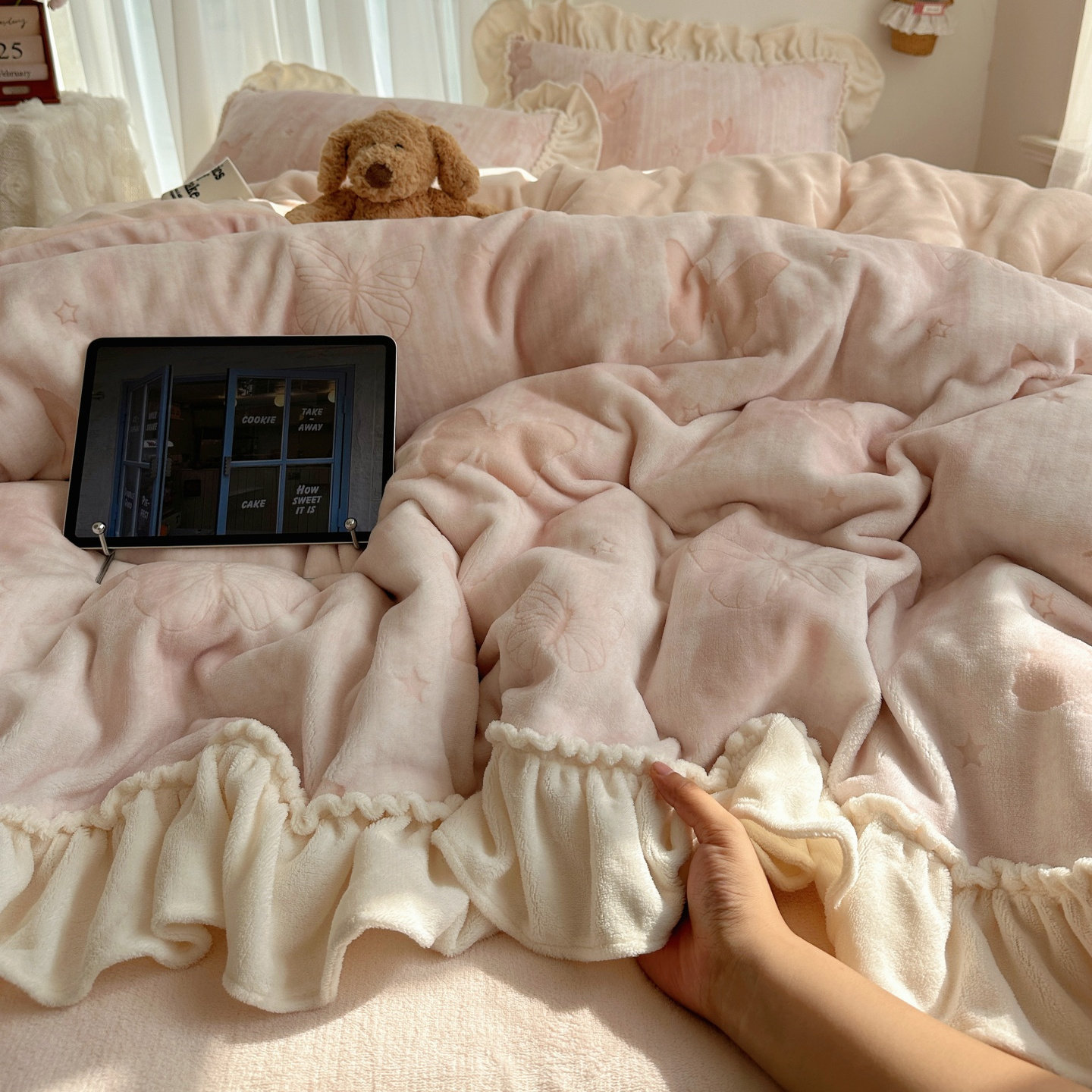 法式蝴蝶结牛奶绒四件套粉色少女珊瑚绒双面绒被套法兰绒床裙床单