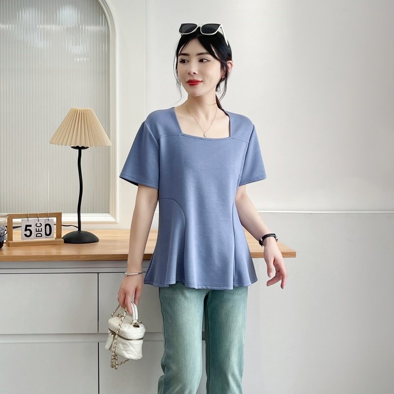 2025夏装韩版新款套头衫设计感方领收腰藏肉短袖大码纯色正肩T恤