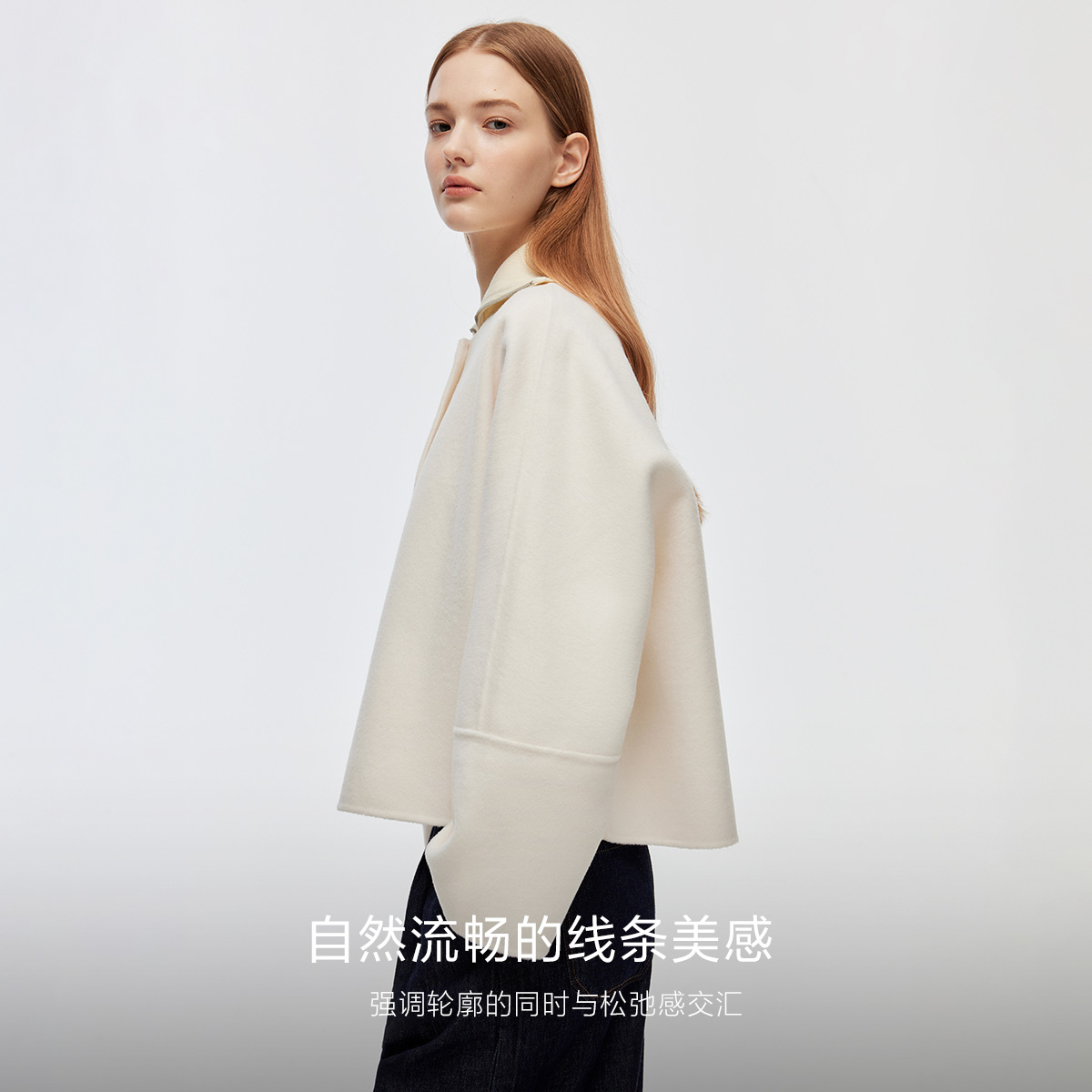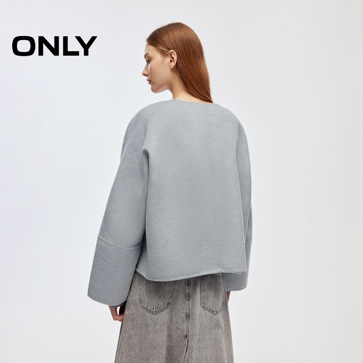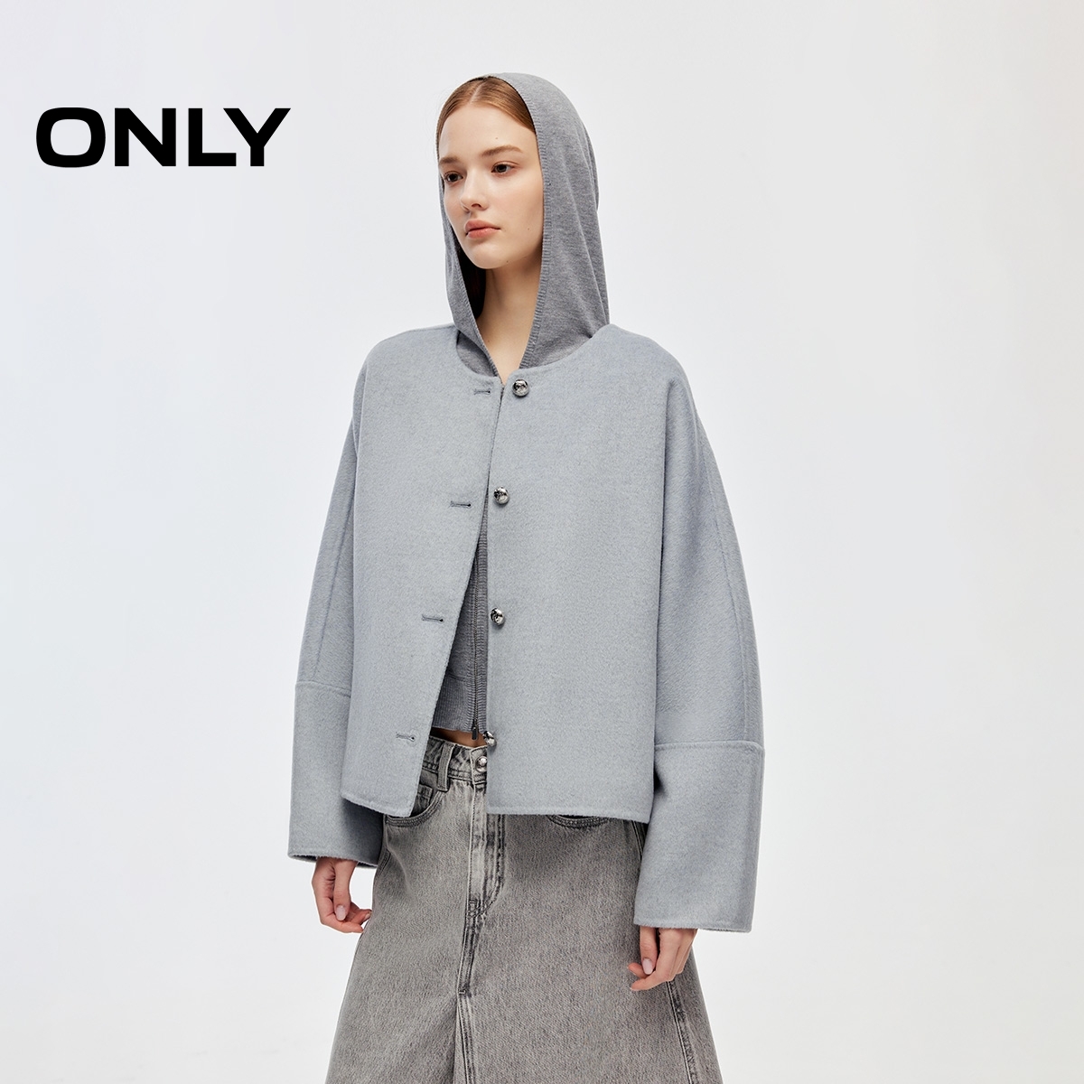 ONLY2025秋季新款优雅双面呢简约宽松短款立体纽扣毛呢大衣女