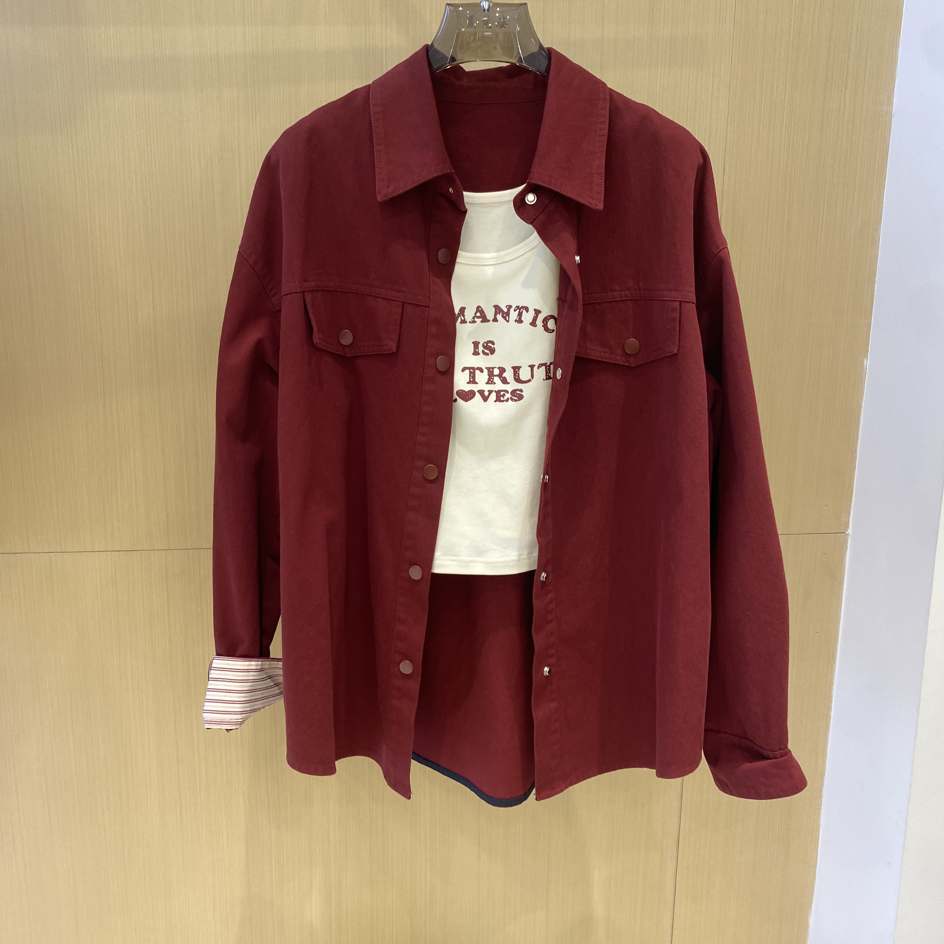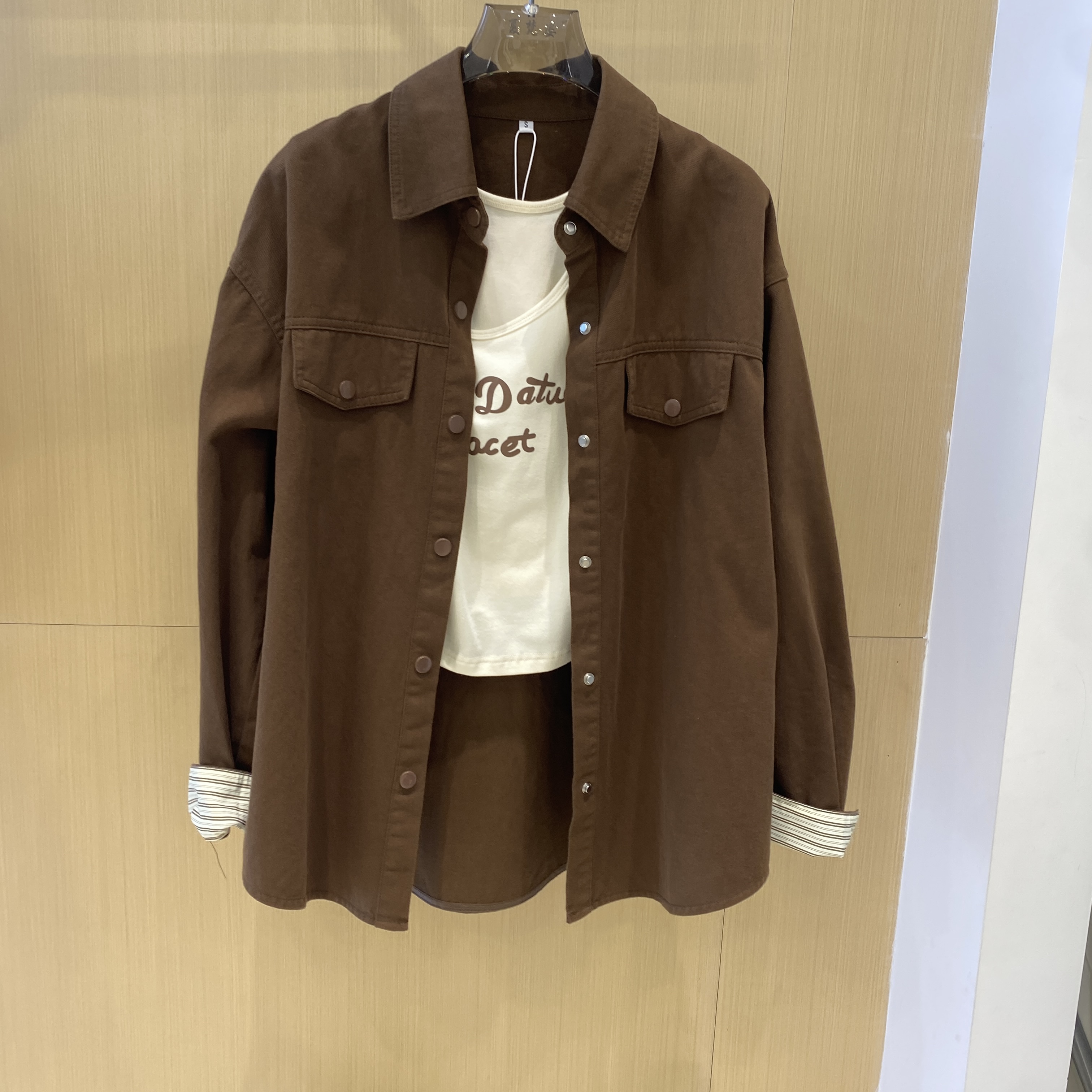 字母吊带背心衬衫外套上衣两件套装短款短外套复古小个子翻领港味