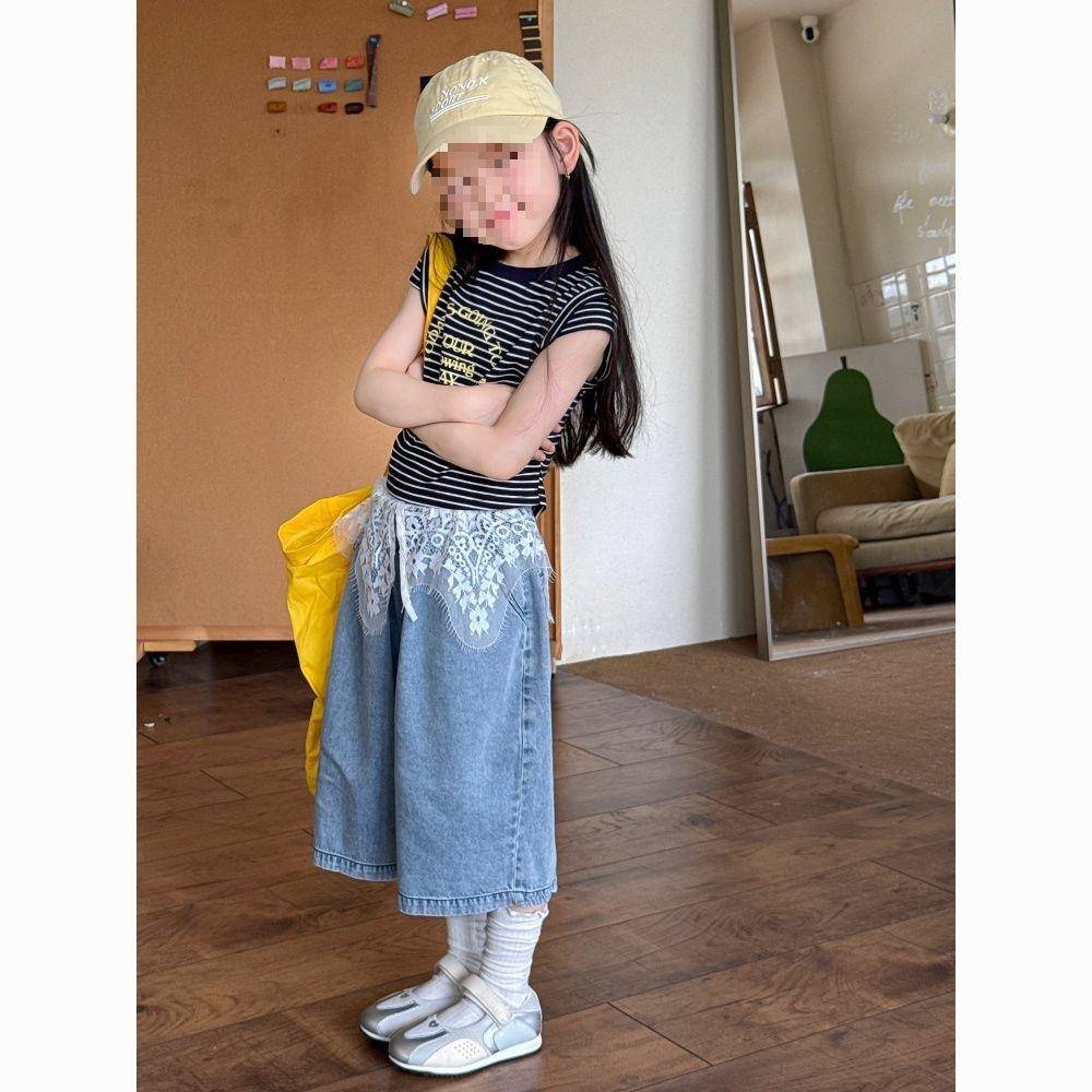 女童韩版夏季套装条纹短袖牛仔裤蕾丝花边七分裤薄款两件套潮百搭