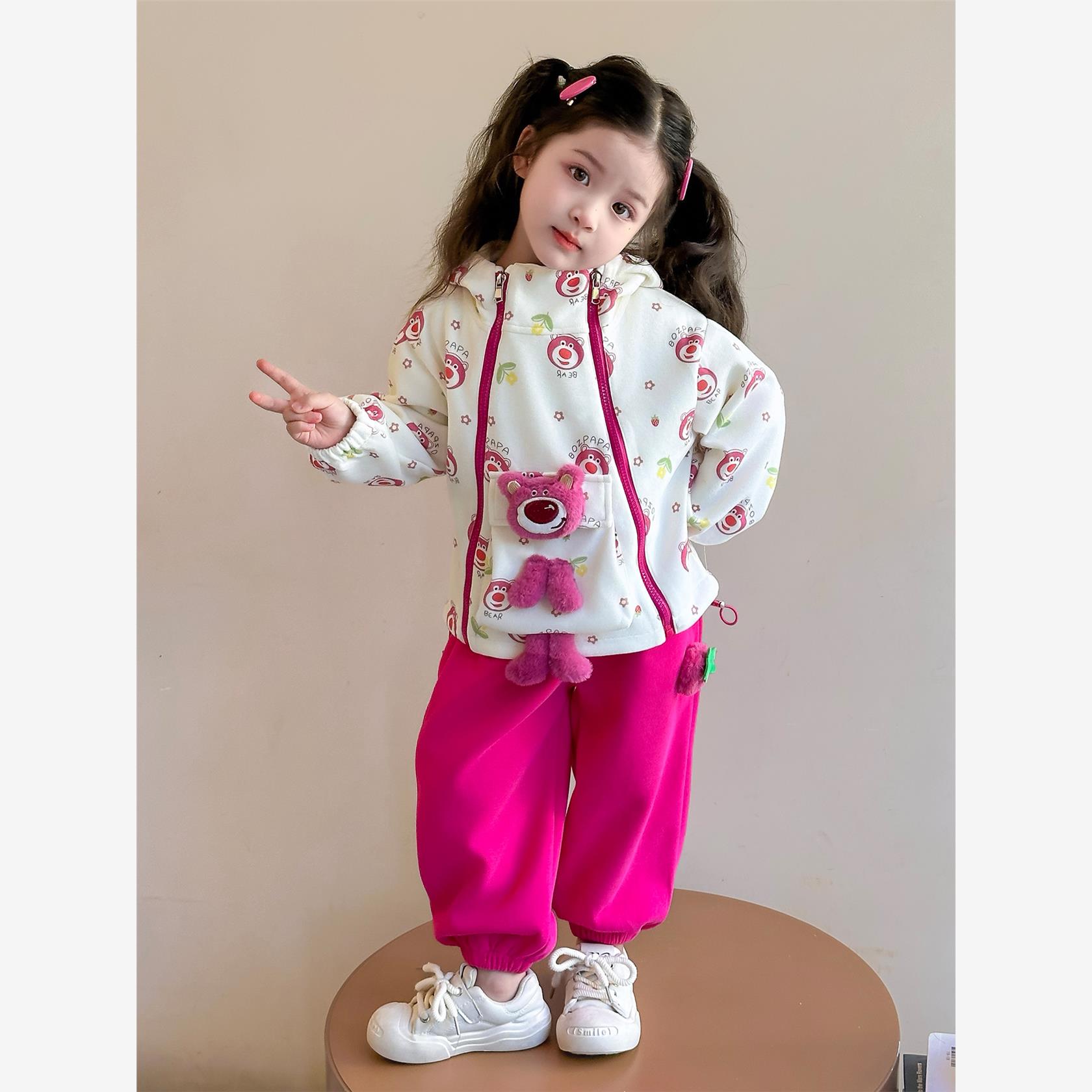 女童套装秋装2025新款女宝宝可爱草莓熊连帽外套休闲裤运动两件套