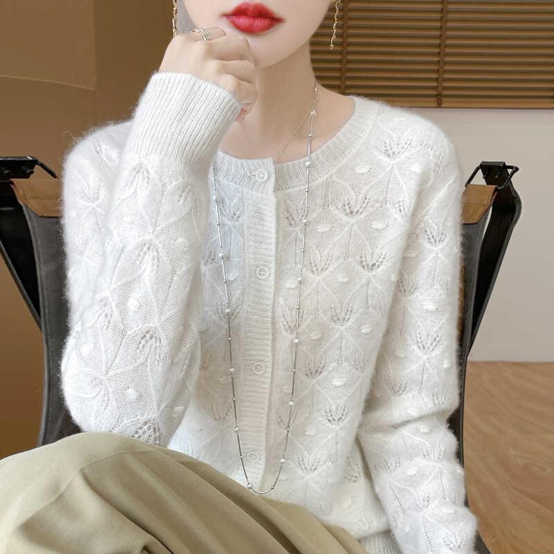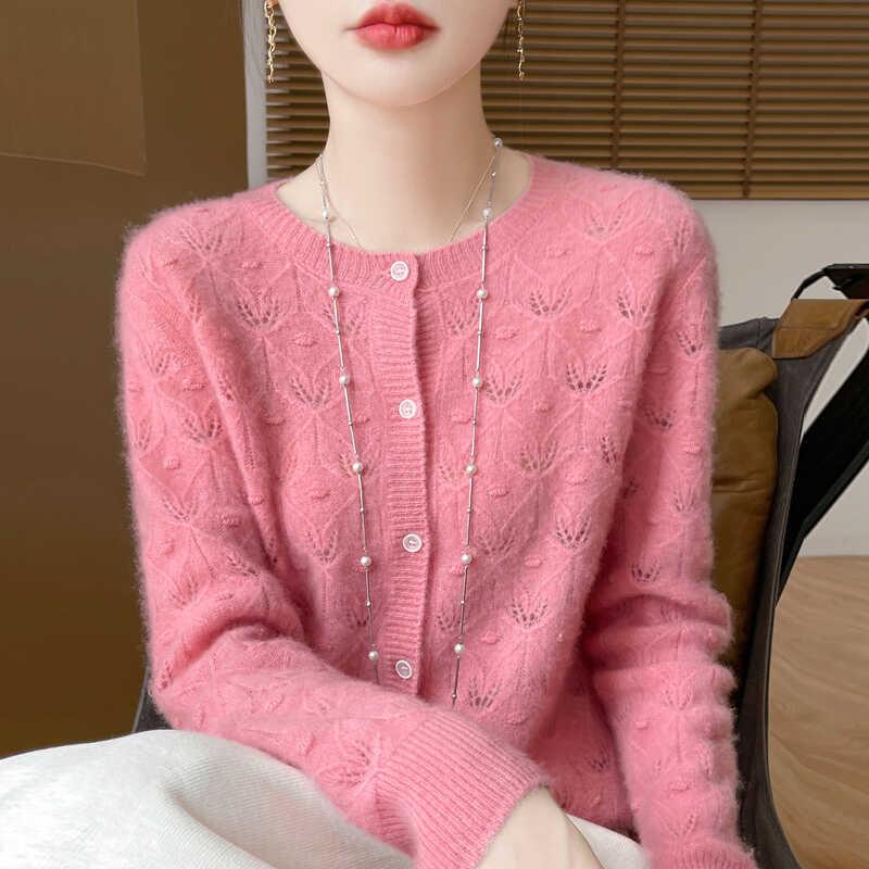 秋冬镂空钩花%纯羊毛开衫女圆领长袖针织外套宽松羊绒衫外搭