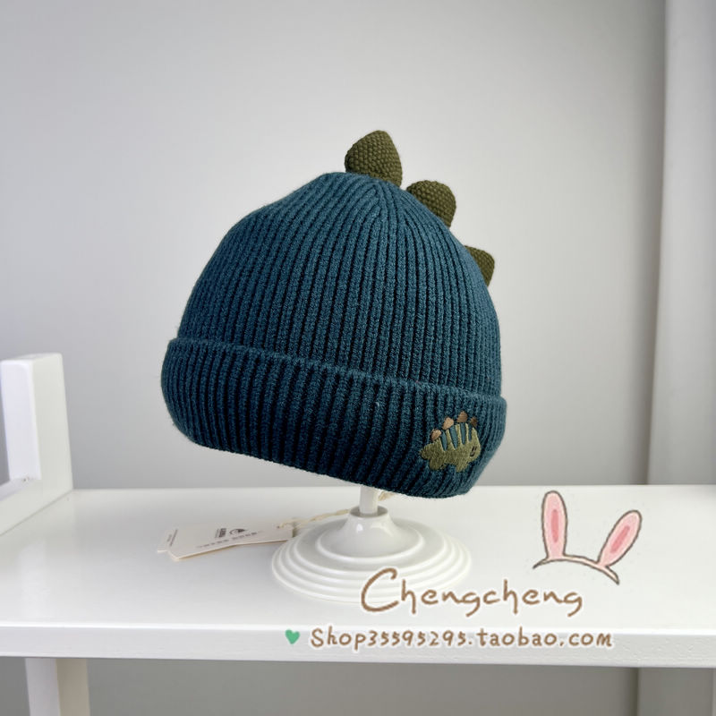 包邮木然良品冬季新男女宝宝婴儿童刺绣恐龙双层洋气翻边毛线帽子