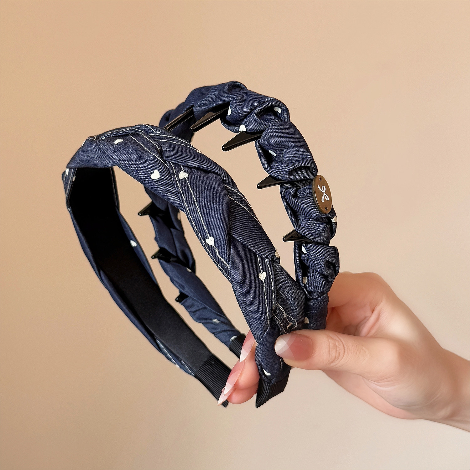 学院风牛仔蓝爱心波点发箍