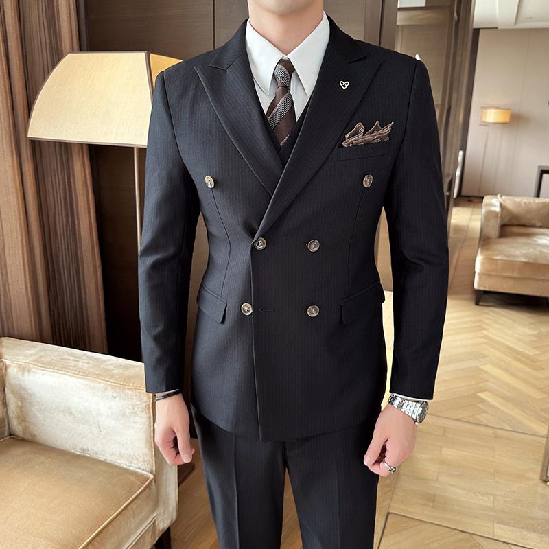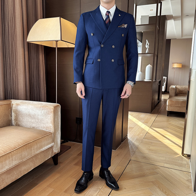 戗驳领双排扣条纹西服男修身套装