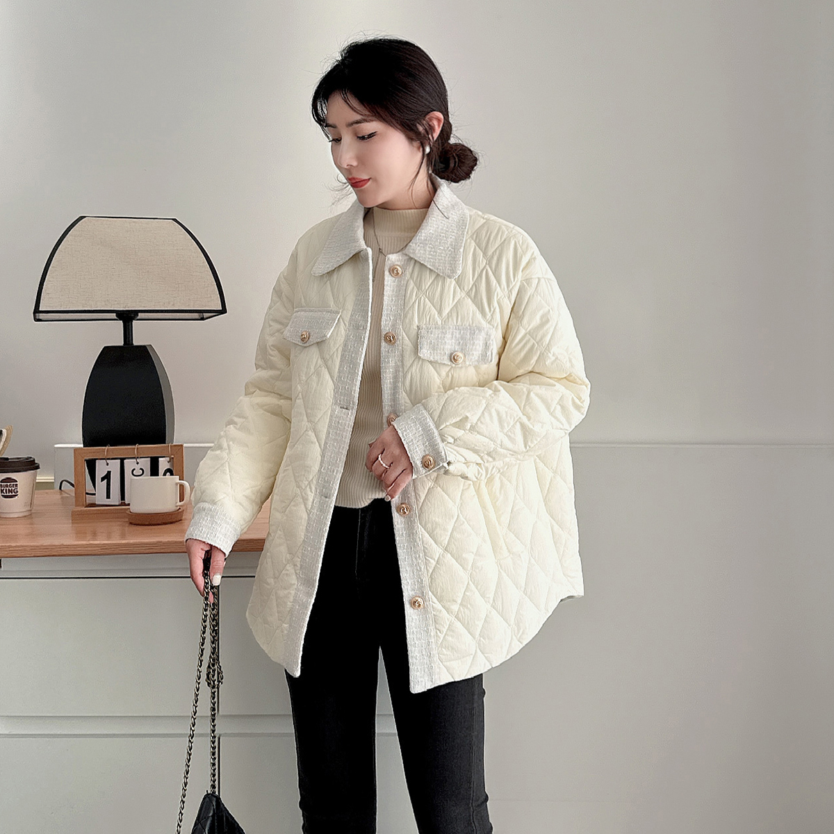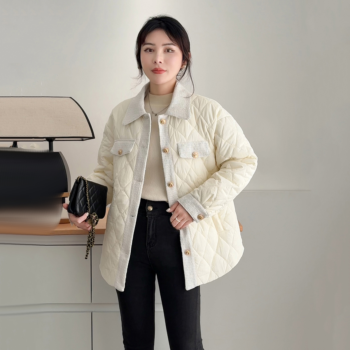 小香风韩系棉服女2024秋冬装大码胖mm高级超好看轻薄夹棉棉衣外套