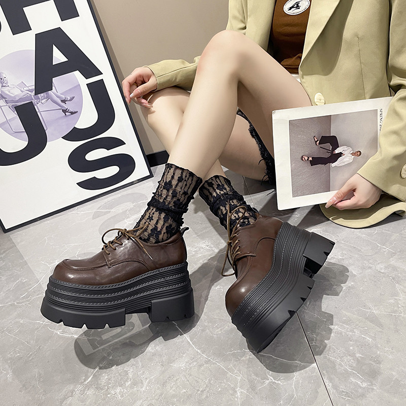 欧洲站学院风厚底系带乐福鞋女2025春季新款10cm粗跟增高小皮鞋女